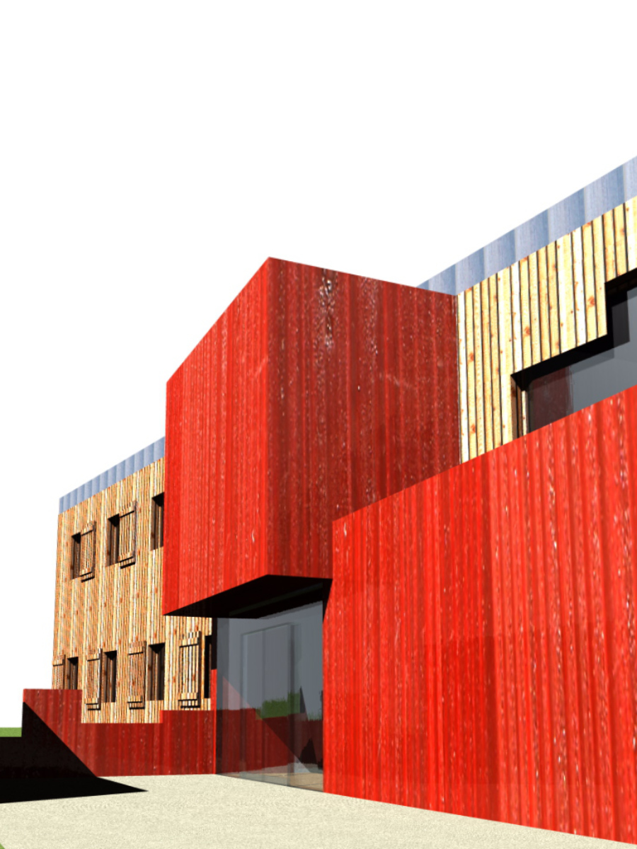 La façade est ouverte et aléatoire au sud pour les salles de vie, avec jeu de fenêtres «adultes» ouvrantes, permettant l’accès à l’extérieur et l’aération, et fenêtres «enfants» fixes, jouant avec le bardage sur les formes et la lumière et offrant en continu de nouvelles perspectives visuelles.