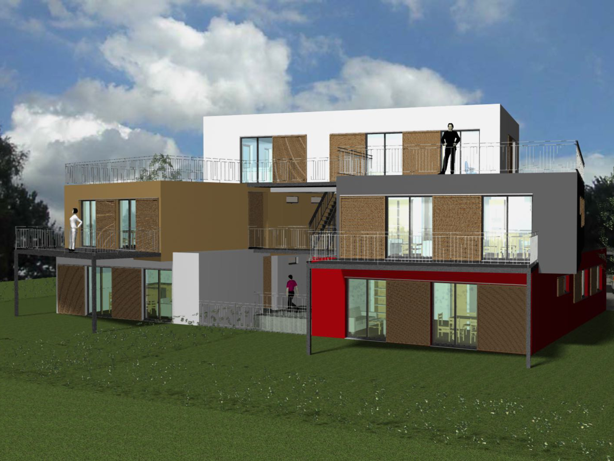 Mandatés par IMRO Immobilière Romande SA pour réaliser 5 logements sur cette parcelle à Meyrin, nous avons élaboré ce projet original d’habitat groupé sur 3 niveaux s’insérant au centre de la parcelle.