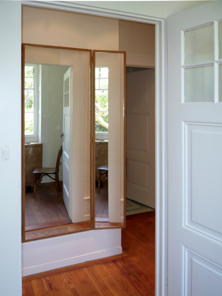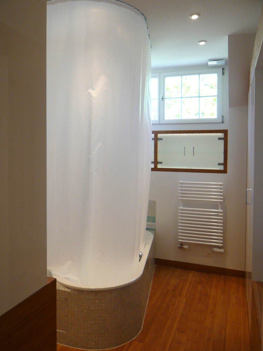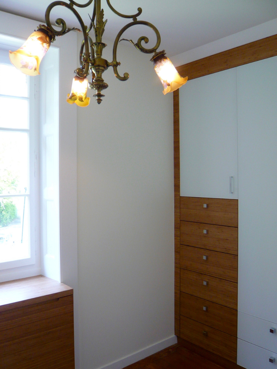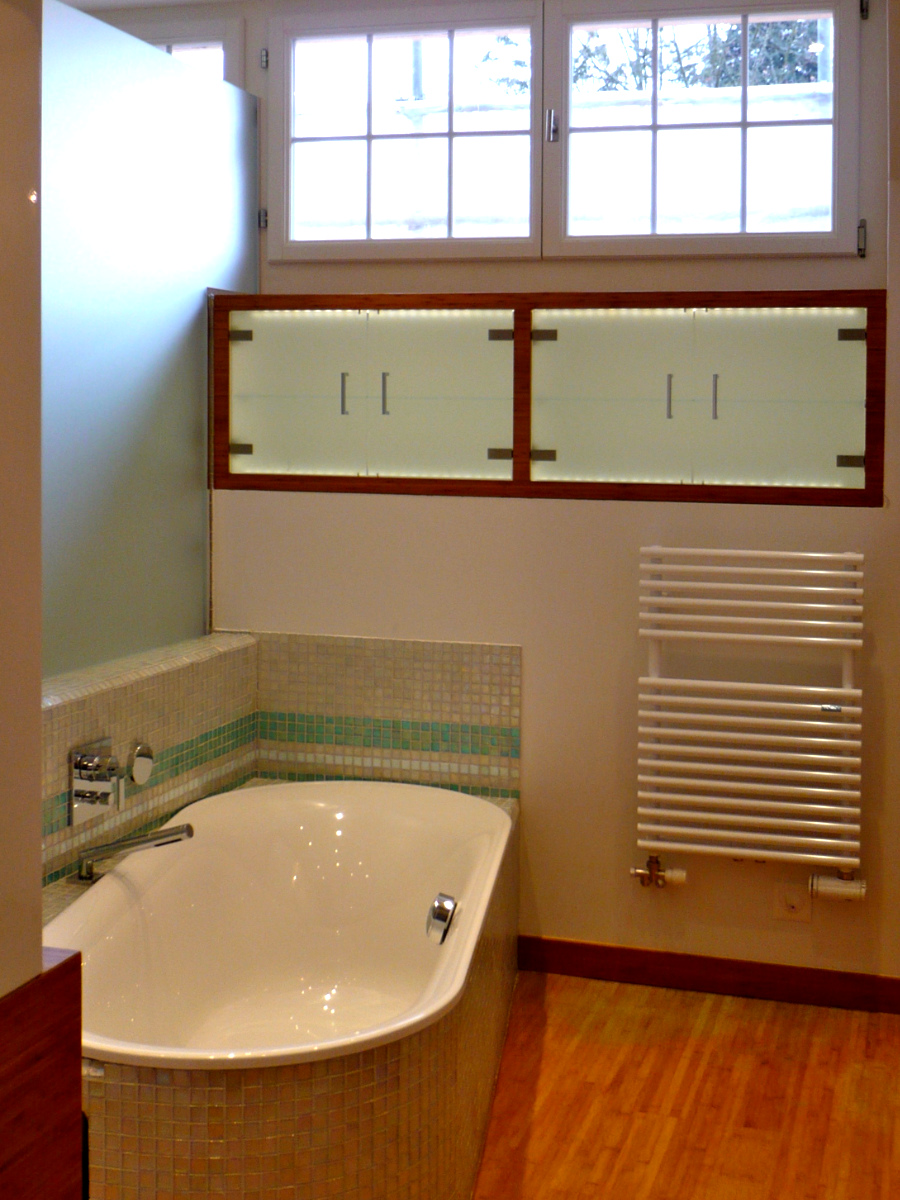 Suite à ces travaux, les propriétaires nous ont demandé de transformer la salle de bain du premier étage et y adjoignant un dressing. Là aussi, une continuité dans l’esprit de la maison a été recherchée tout en créant un ensemble sanitaire répondant aux besoins actuels en terme de fonctionnalité et de design.
