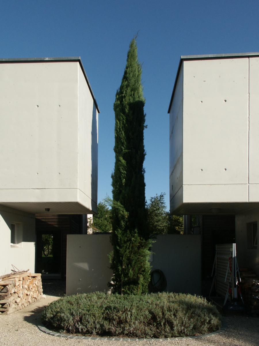 Une des données de base à laquelle je tenais pour le plan de ces maisons était de pouvoir appréhender sa volumétrie extérieure de l’intérieur, voir de l’intérieur sa façade, ainsi que l’inverse.