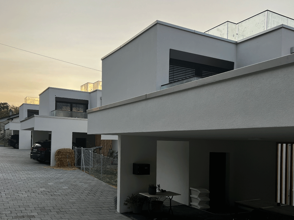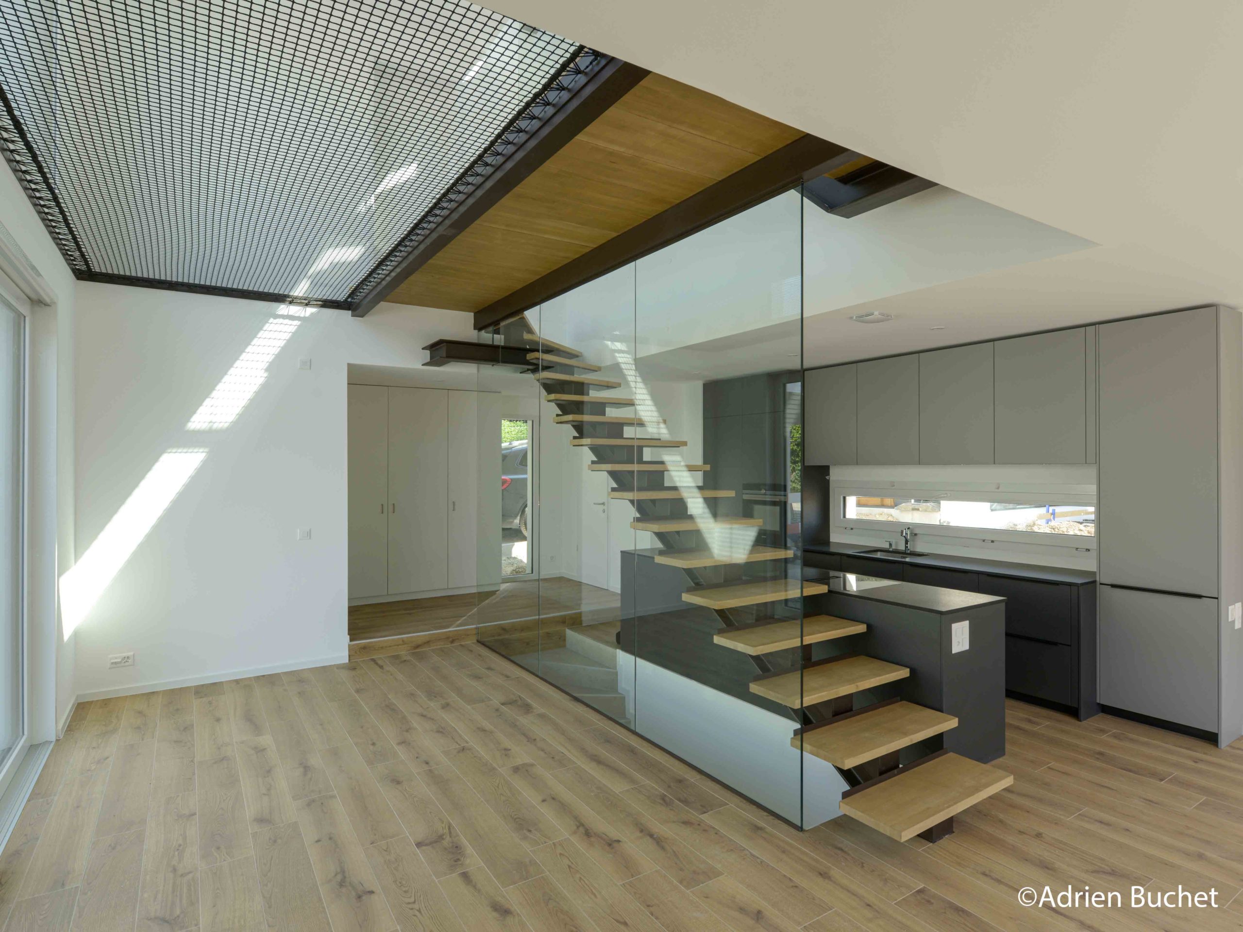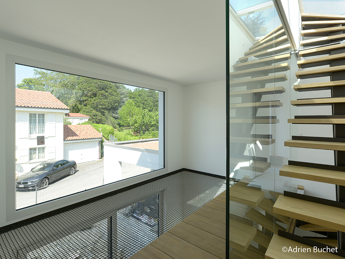 Distribuée sur 3 niveaux et dotée d’un toit-terrasse de 30 m2 avec vue dégagée sur le Salève, chaque maison est entièrement excavée. Leur style contemporain se définit par les lignes épurées des façades et par sa construction responsable. Baignées de lumière naturelle grâce à de larges baies vitrées, notamment dans l’espace de vie dont la baie-vitrée double hauteur offre un volume lumineux et une transition naturelle avec les extérieurs. Au sous-sol, une vaste salle multifonctions de 30 m2 éclairée naturellement par une cour à l’anglaise. Les murs du sous-sol sont en béton traditionnel, le rez-de-chaussée et l’étage en structure métallique préfabriquée permettent de réduire la durée de construction d’une part, et de gagner en précision dans la réalisation des détails d’autre part. Des fenêtres triple vitrage en bois-métal ont été posées dans des façades isolées à la laine de roche et une finition en crépi.