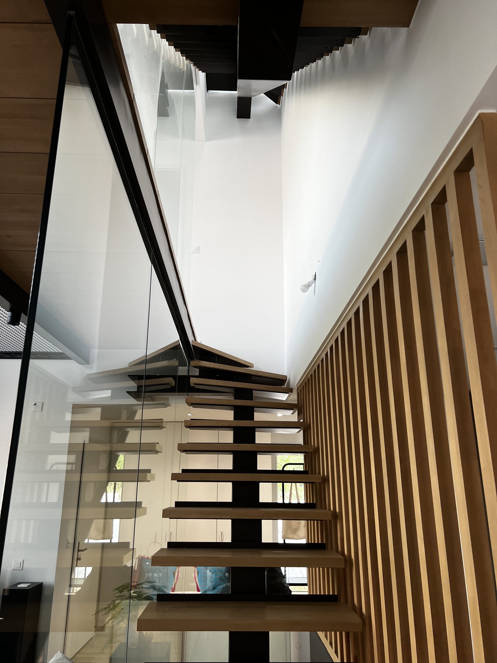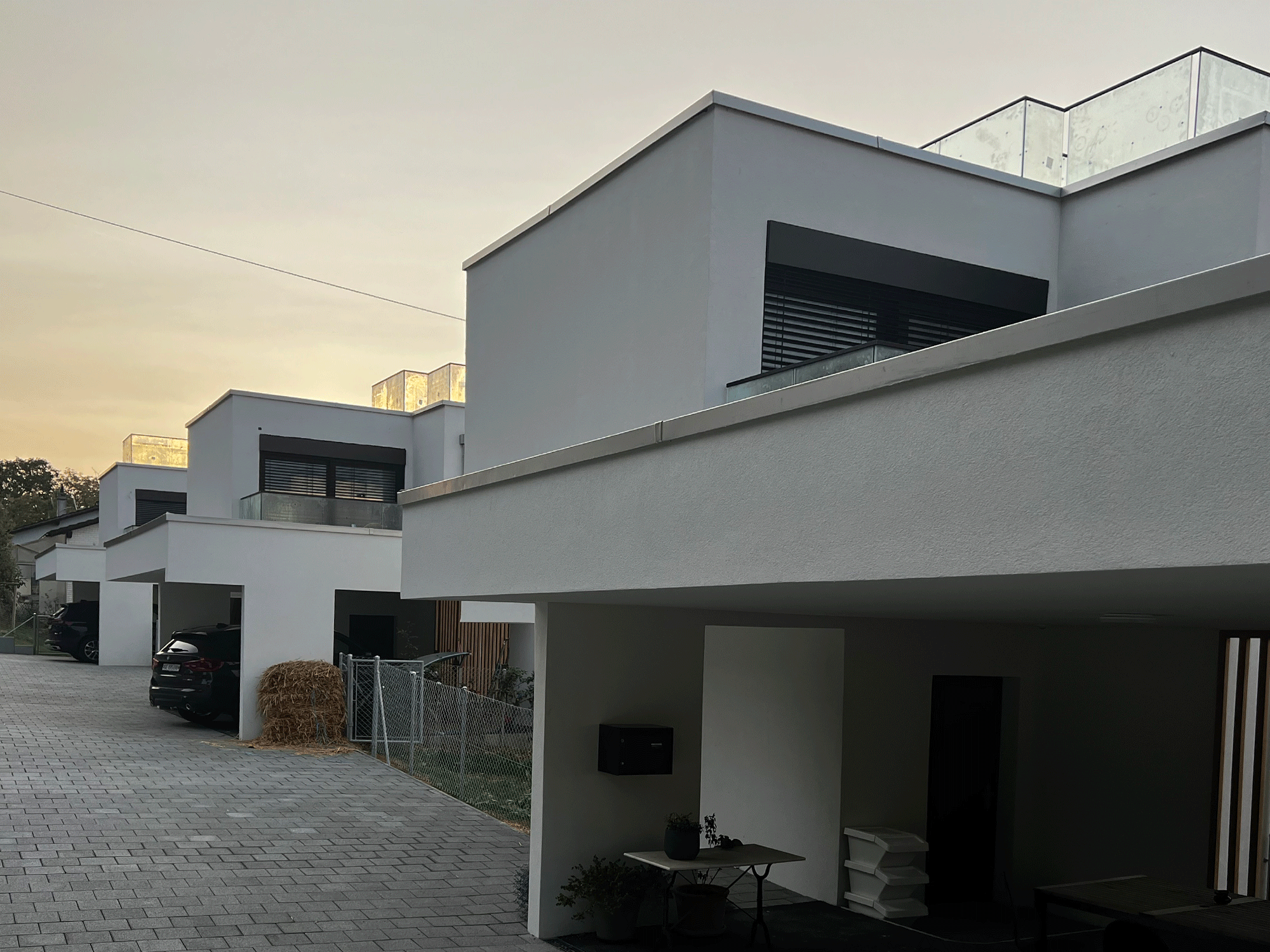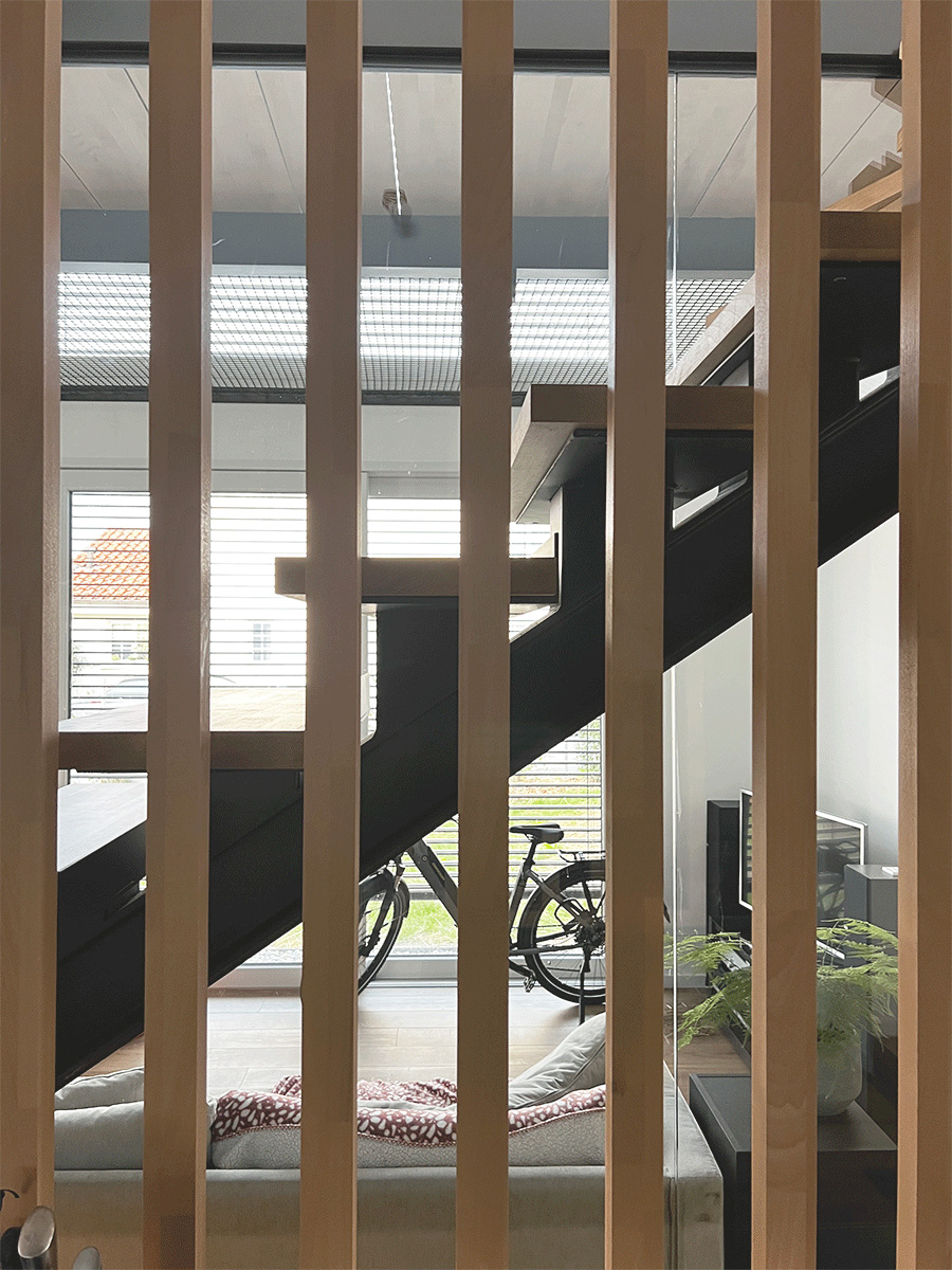 Distribuée sur 3 niveaux et dotée d’un toit-terrasse de 30 m2 avec vue dégagée sur le Salève, chaque maison est entièrement excavée. Leur style contemporain se définit par les lignes épurées des façades et par sa construction responsable. Baignées de lumière naturelle grâce à de larges baies vitrées, notamment dans l’espace de vie dont la baie-vitrée double hauteur offre un volume lumineux et une transition naturelle avec les extérieurs. Au sous-sol, une vaste salle multifonctions de 30 m2 éclairée naturellement par une cour à l’anglaise. Les murs du sous-sol sont en béton traditionnel, le rez-de-chaussée et l’étage en structure métallique préfabriquée permettent de réduire la durée de construction d’une part, et de gagner en précision dans la réalisation des détails d’autre part. Des fenêtres triple vitrage en bois-métal ont été posées dans des façades isolées à la laine de roche et une finition en crépi.