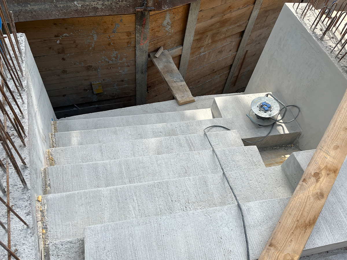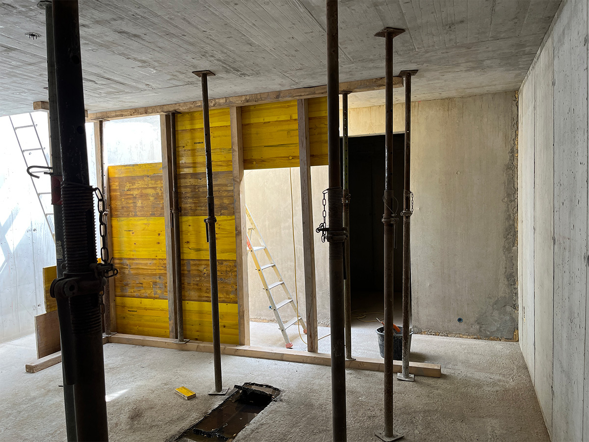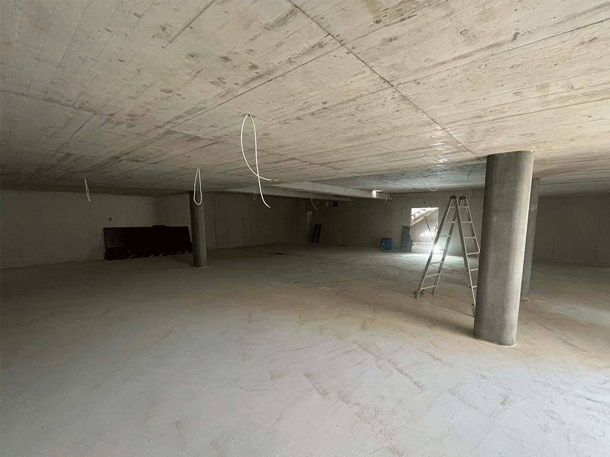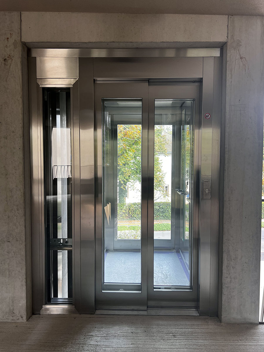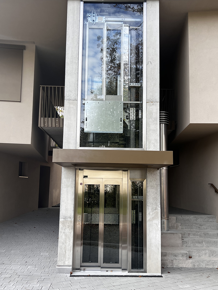 Afin de s’affranchir de l’impact visuel d’une rampe pour le parking en sous-sol, une plateforme à voitures permet un accès plus discret.