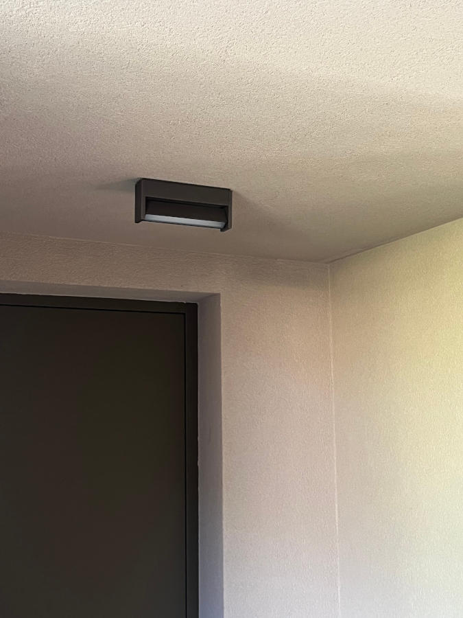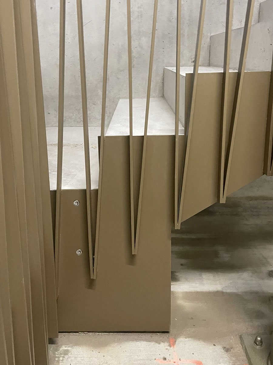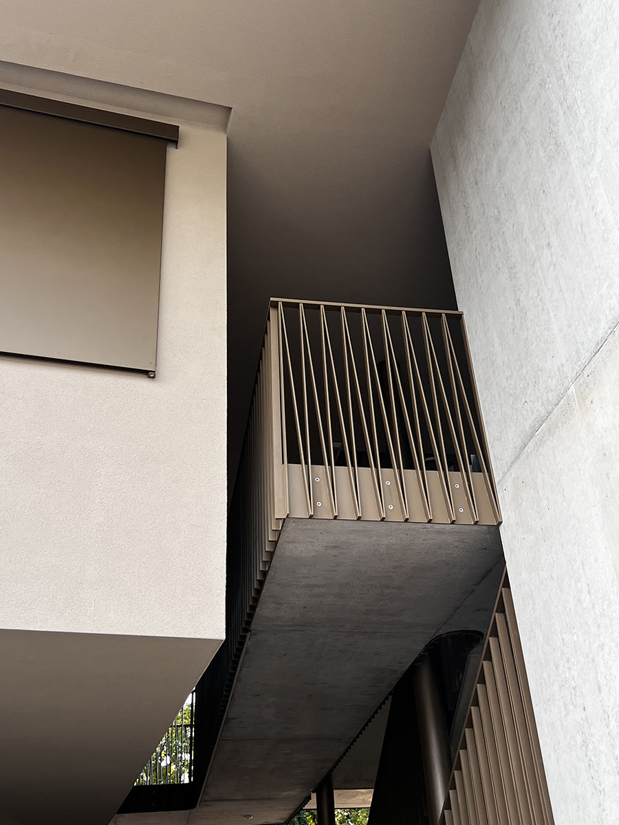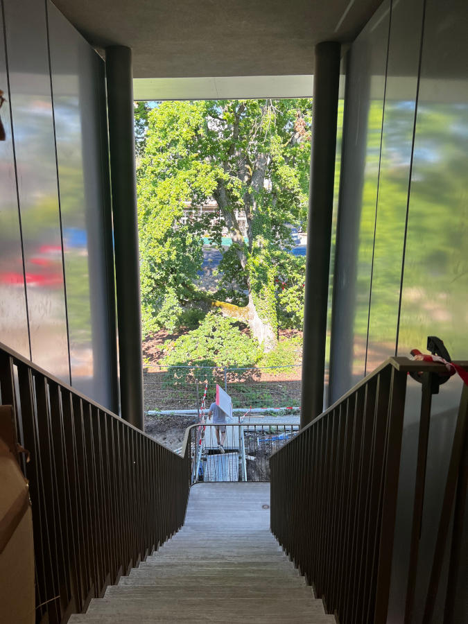 L’attique a un revêtement de façade en bardage métallique et se distingue des autres volumes afin de le faire « flotter » dans les arbres, et ainsi minimiser son impact visuel par rapport à ceux-ci.