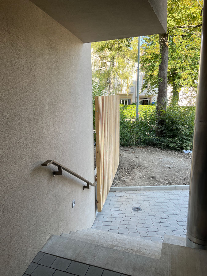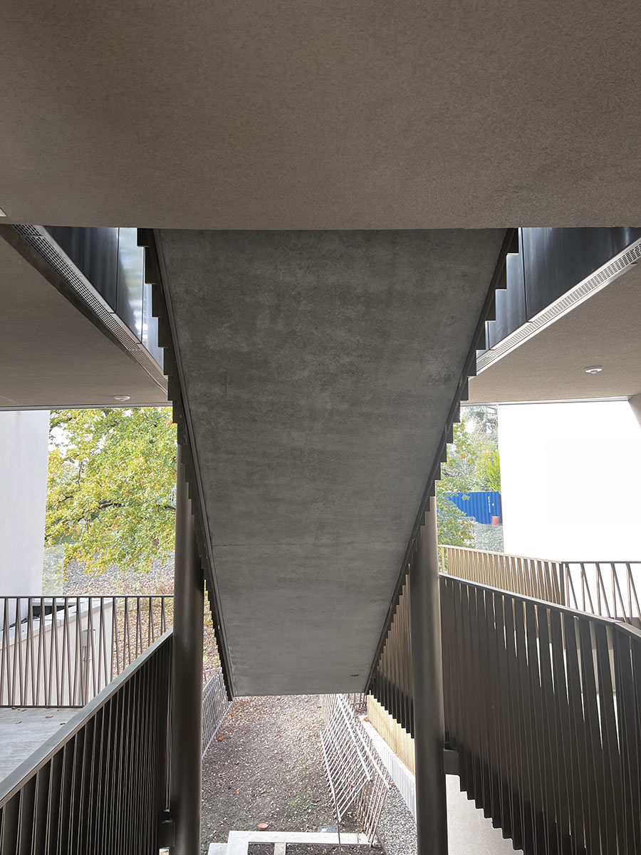 Les parcelles avoisinantes n’étant pas clôturées, le projet appelle à la convivialité car l’ensemble des habitants peuvent profiter du site. Les deux appartements du rez-de-chaussée ont une terrasse privative devant leur séjour afin de préserver leur intimité. Les deux appartements de l’étage ont un grand balcon qui donne sur le jardin de la résidence.
