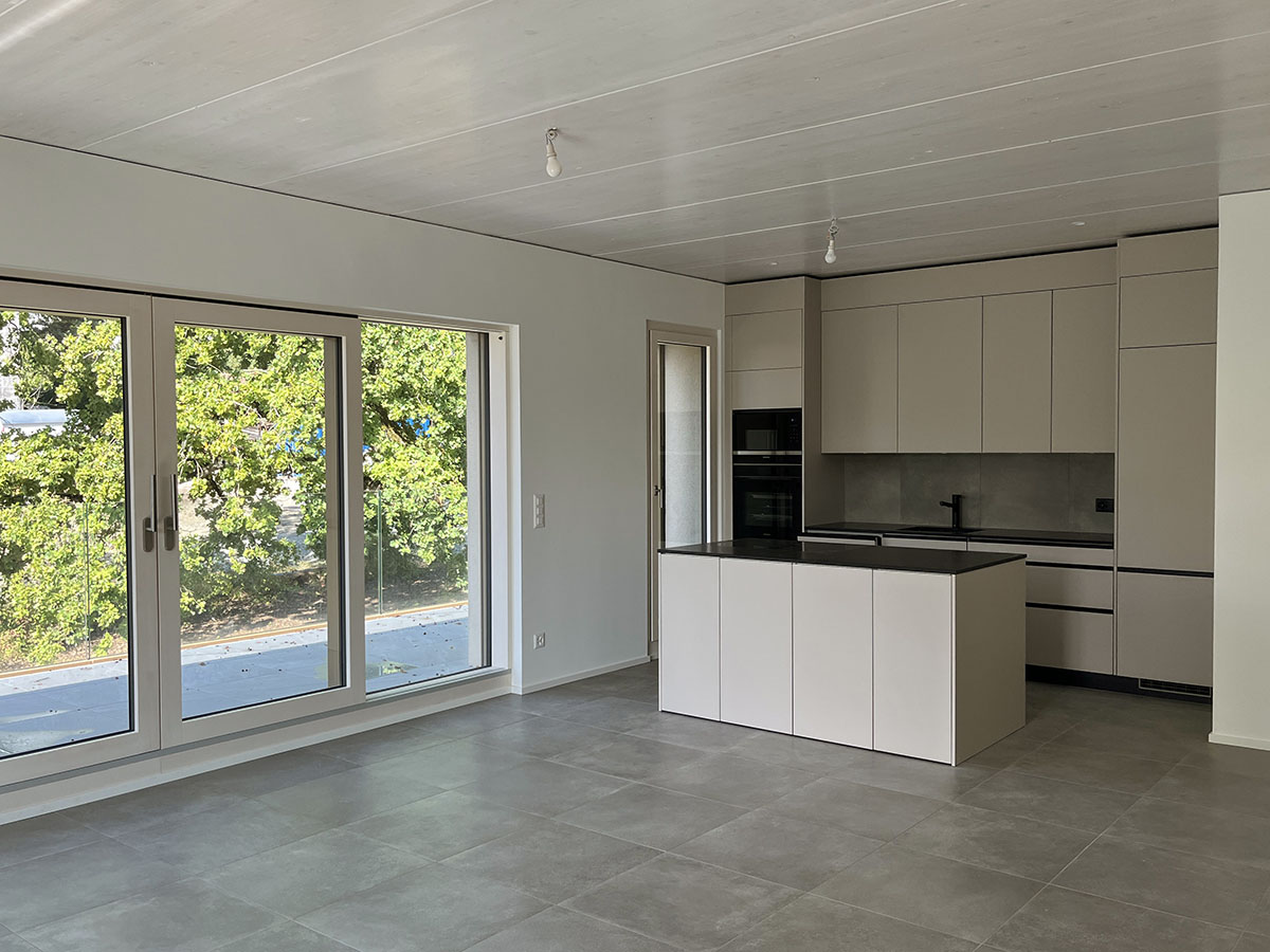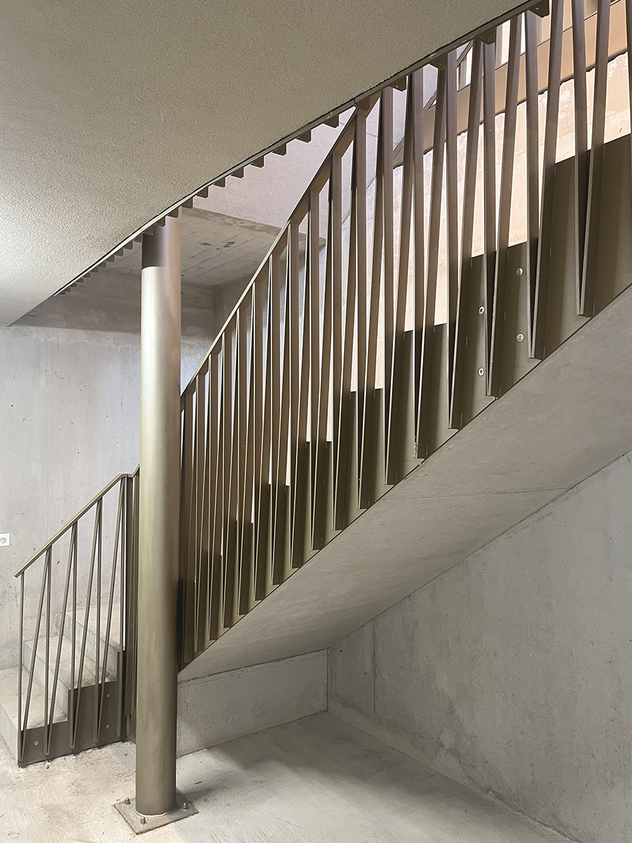 Du point de vue typologique, les cinq appartements sont des 5 pièces. Seul l’attique est différent de par sa position transversale aux autres volumes du bâtiment. Le décalage des volumes les uns par rapport aux autres permet une optimisation de l’implantation vis-à-vis des arbres.
