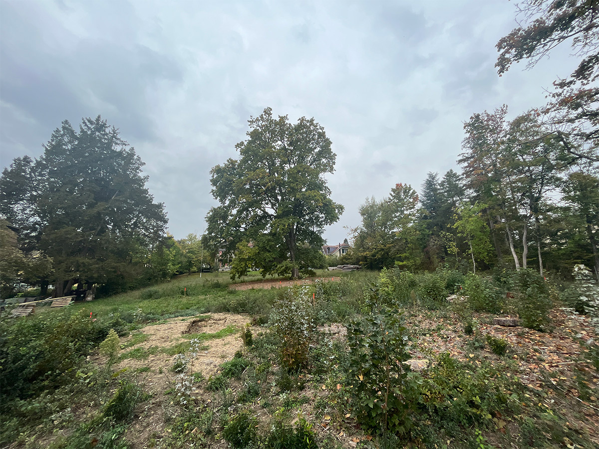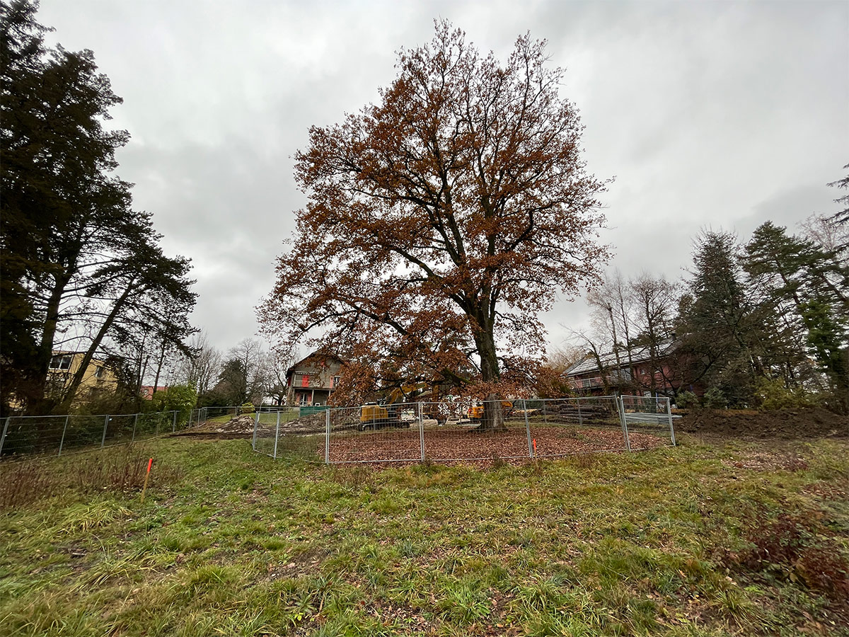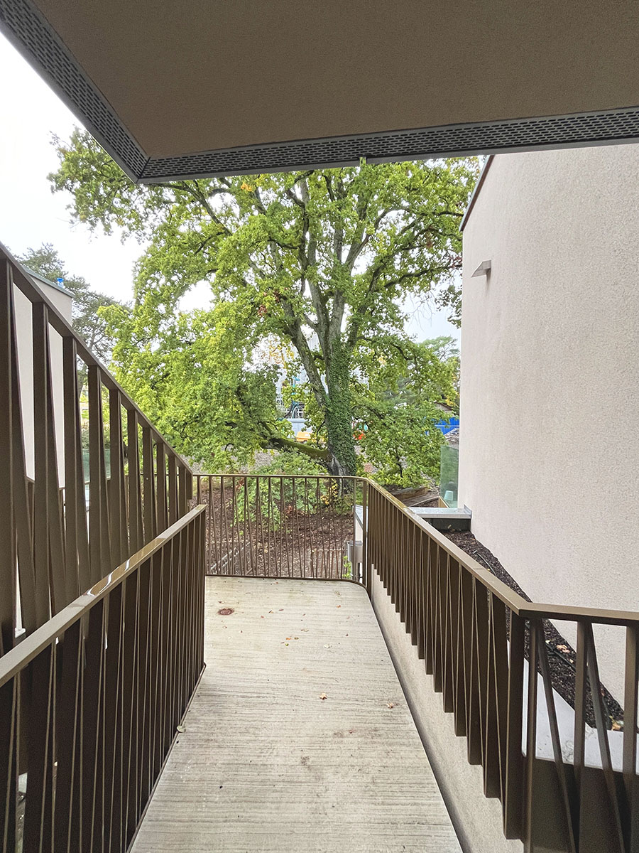 Côté jardin, à l’ouest, le bâtiment « s’enroule » autour du chêne de façon à ce que les cinq appartements profitent de sa vue et de son ombrage en été.