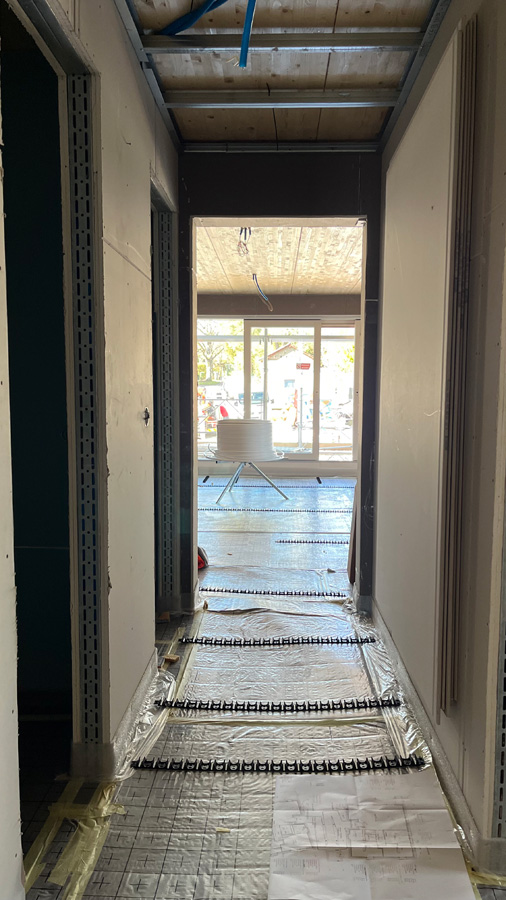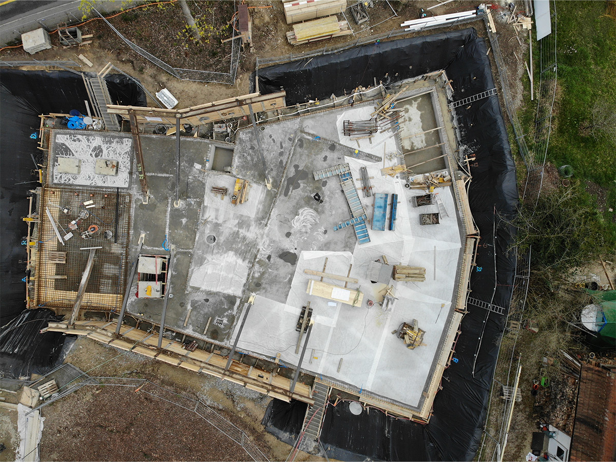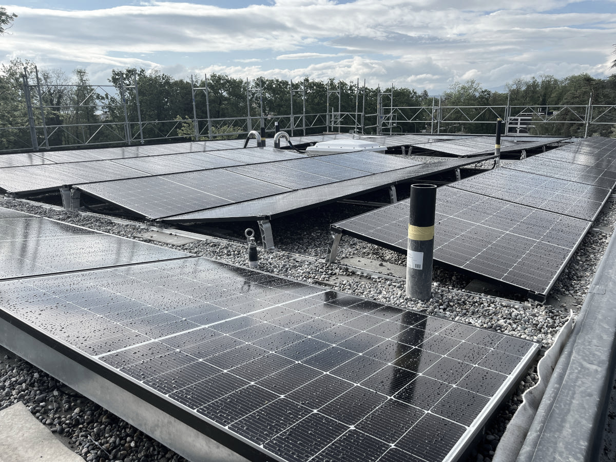 Le chauffage et l’eau chaude sont produits par une PAC géothermique, alimentée par 140m2 de panneau photovoltaïques disposés sur l’entier de la toiture.