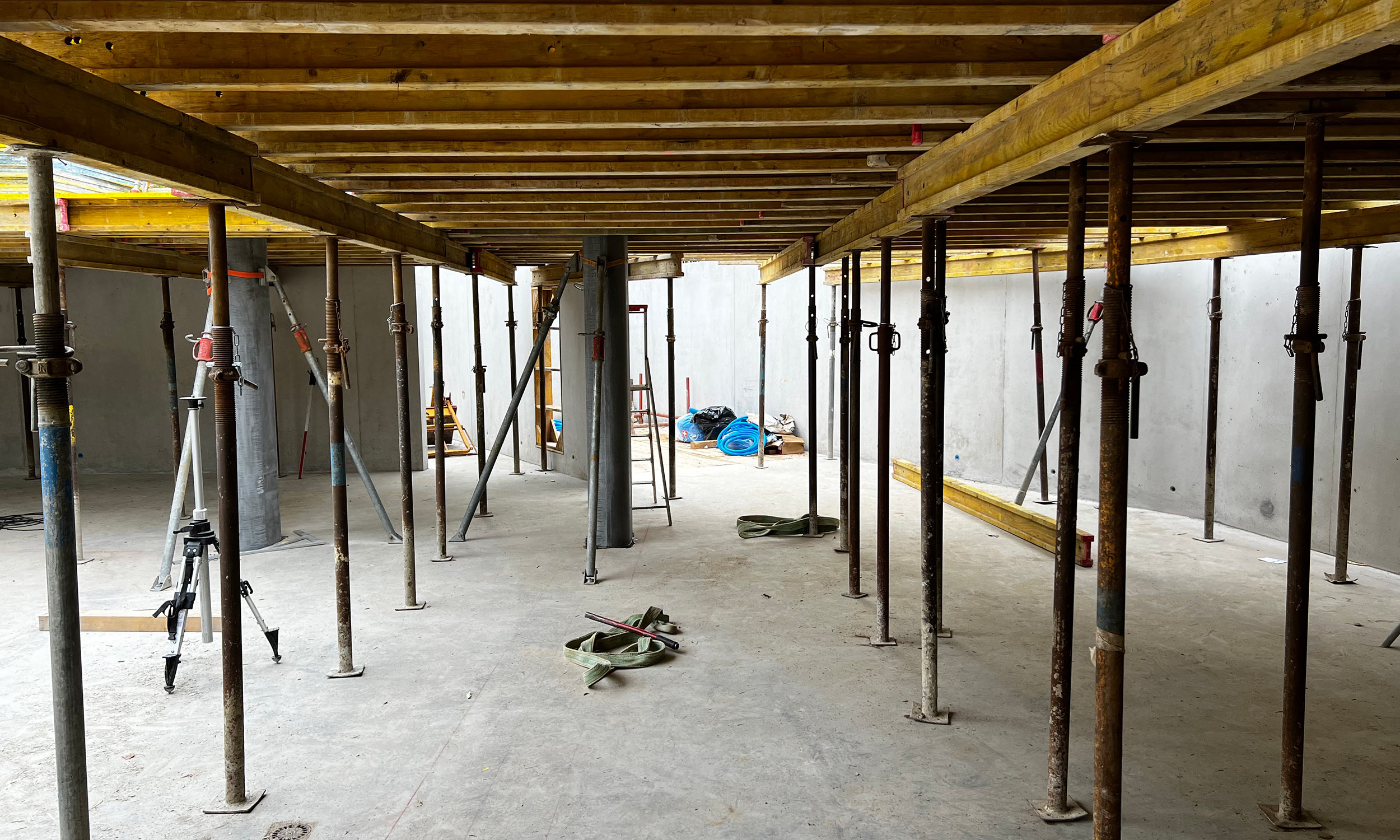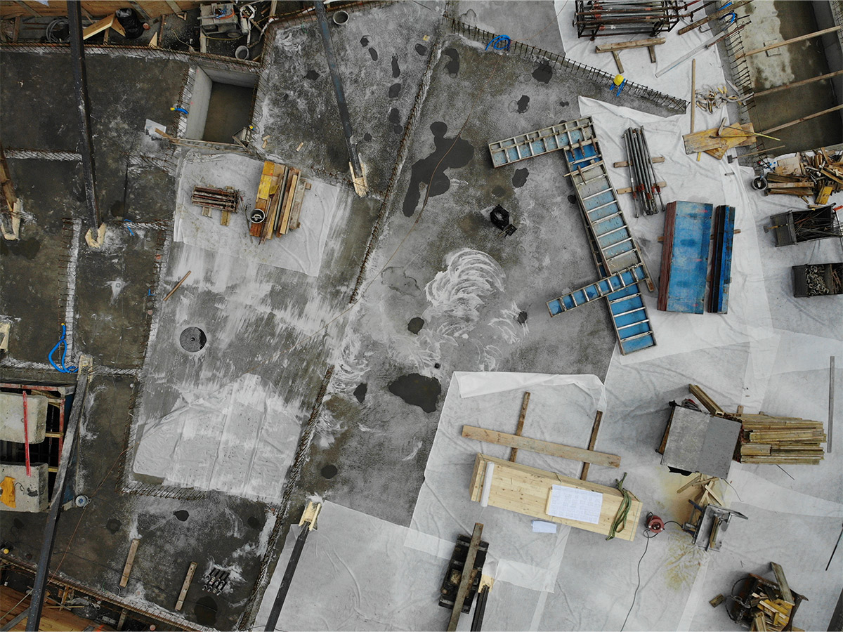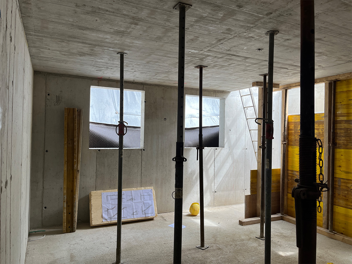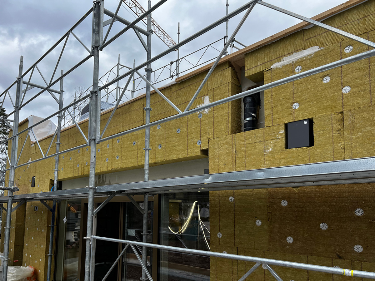 La structure du bâtiment est faite en bois. Les murs sont composés des panneaux bois avec une isolation en laine de roche. Les dalles sont en BLC avec une dalle de compression béton.