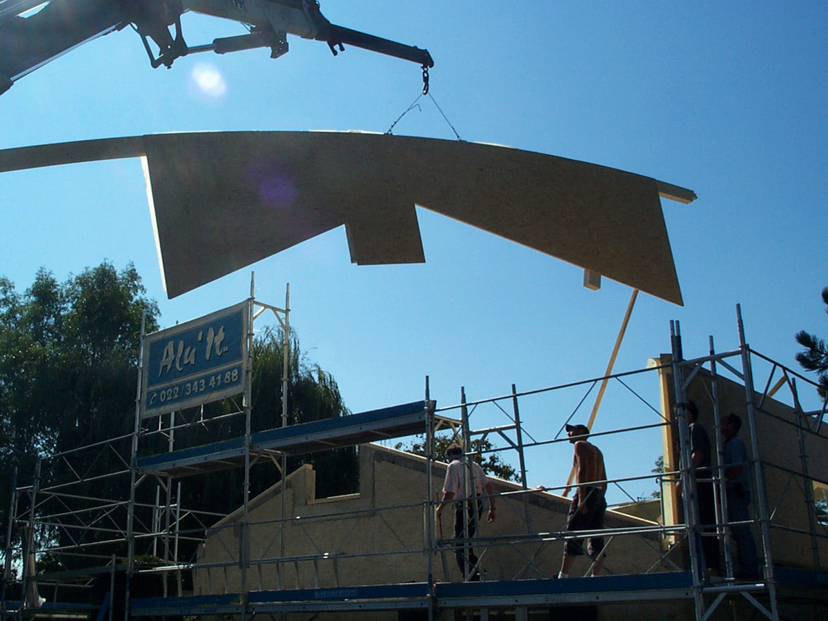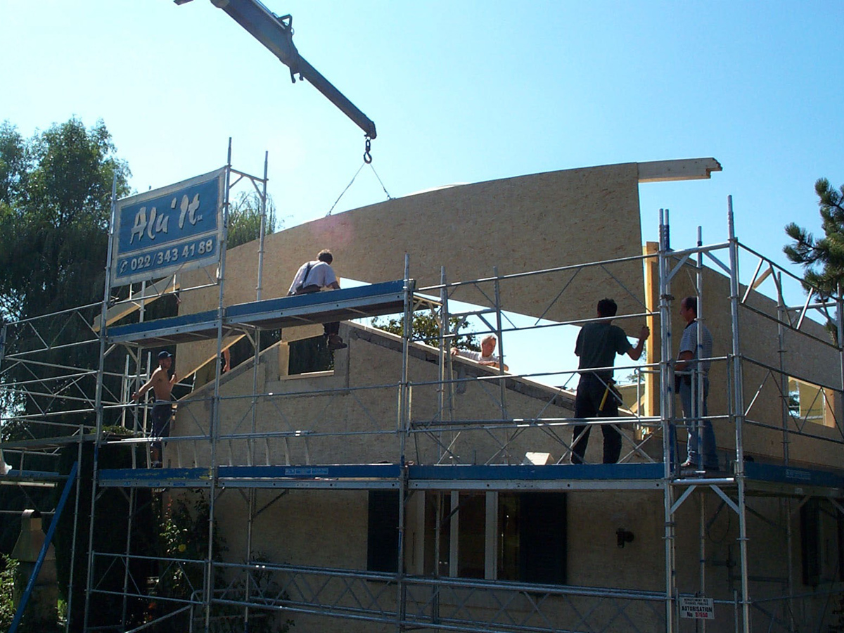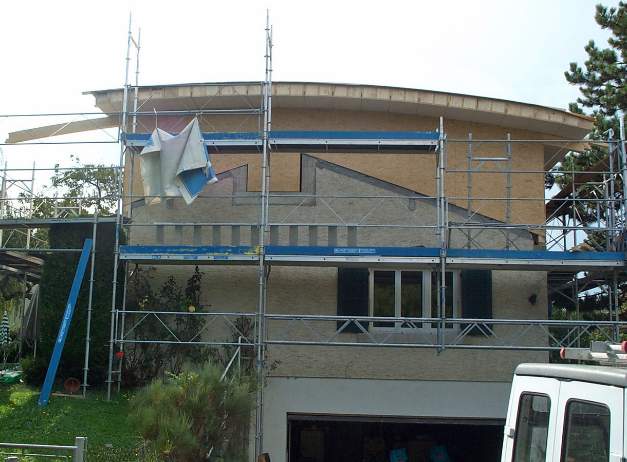 Pour des raisons de budget, une toiture provisoire n’a pas été employée et l’intervention a été limitée à une semaine «sans toiture». Pour répondre à des questions de rapidité d’exécution et de simplicité de mise en œuvre, les murs, le toit et le plancher de l’étage de la surélévation ont été réalisé en ossature de bois.