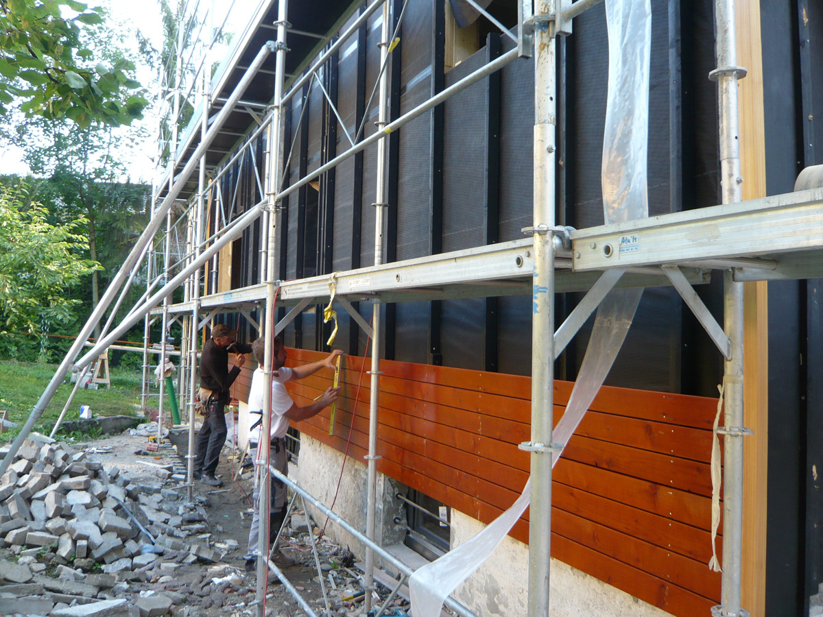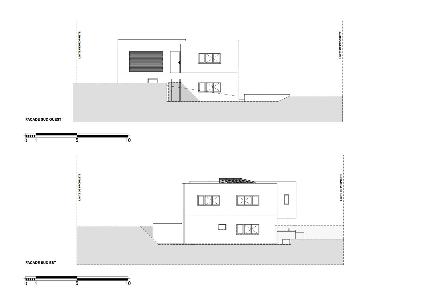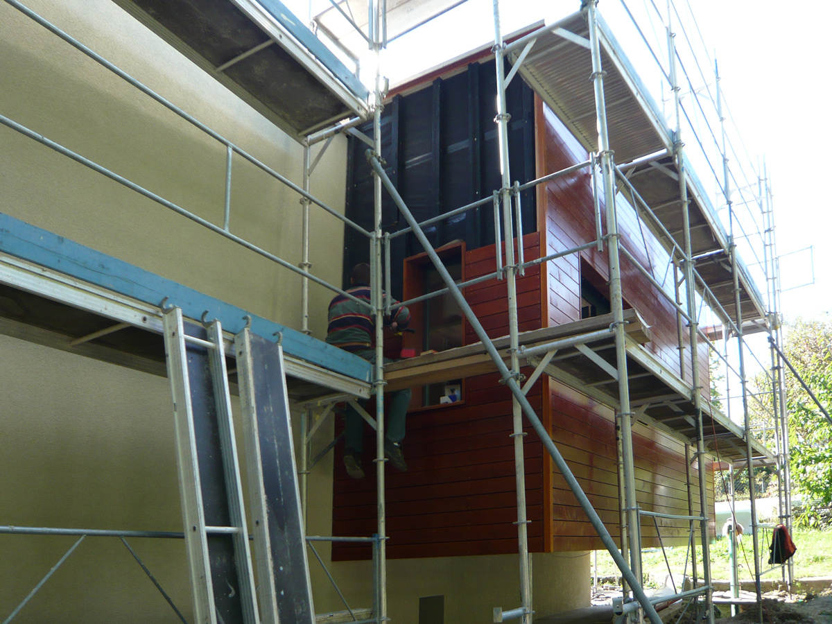 La maison est constituée de deux volumes, l’un en béton l’autre en bois. La partie béton existante a été isolée par l’extérieur et les fondations ont été drainées.