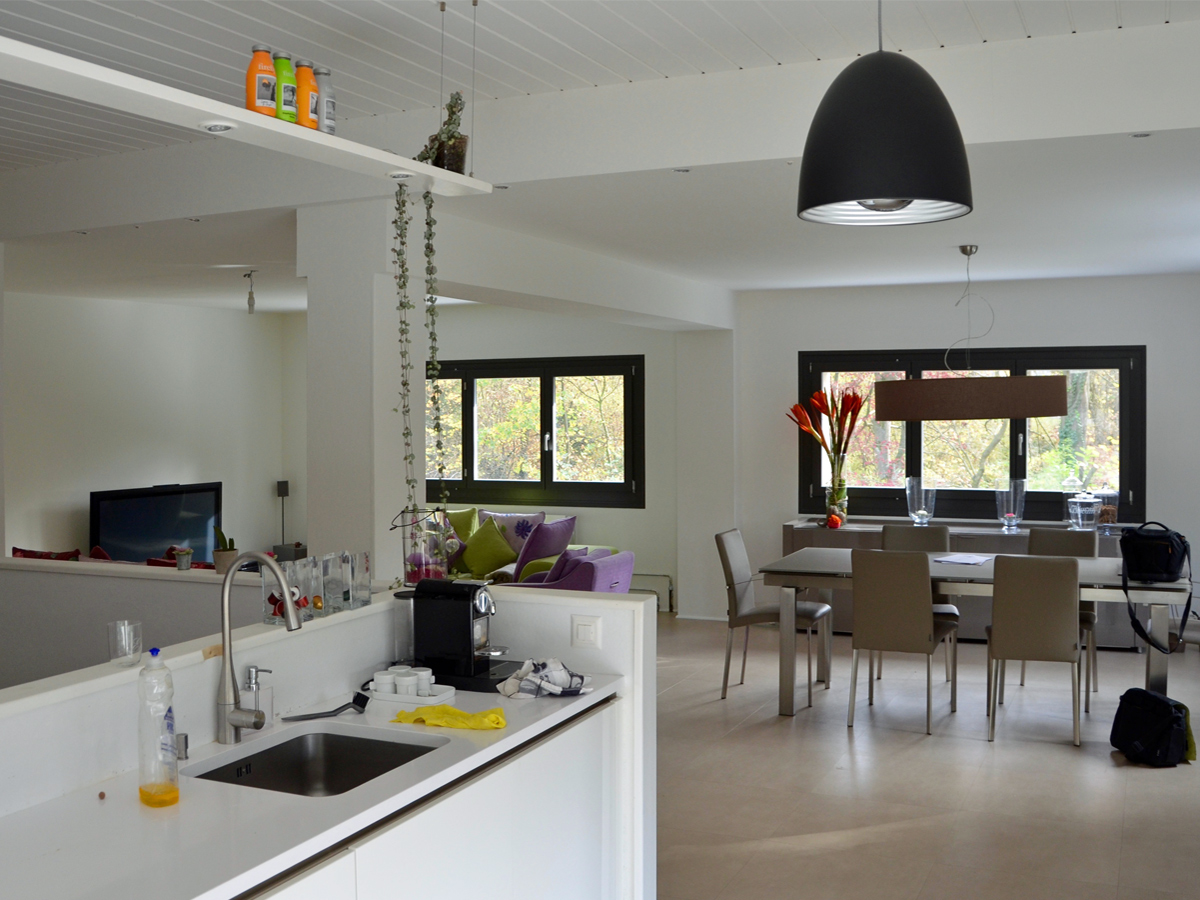 La transformation esthétique est surprenante. La maison telle que les clients l’avaient achetée était un patchwork d’agrandissements au fil du temps. Nous lui avons redonné une unité et un caractère contemporain très affirmé.