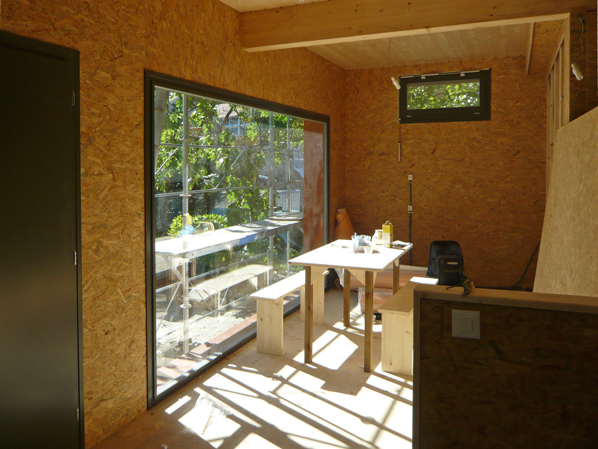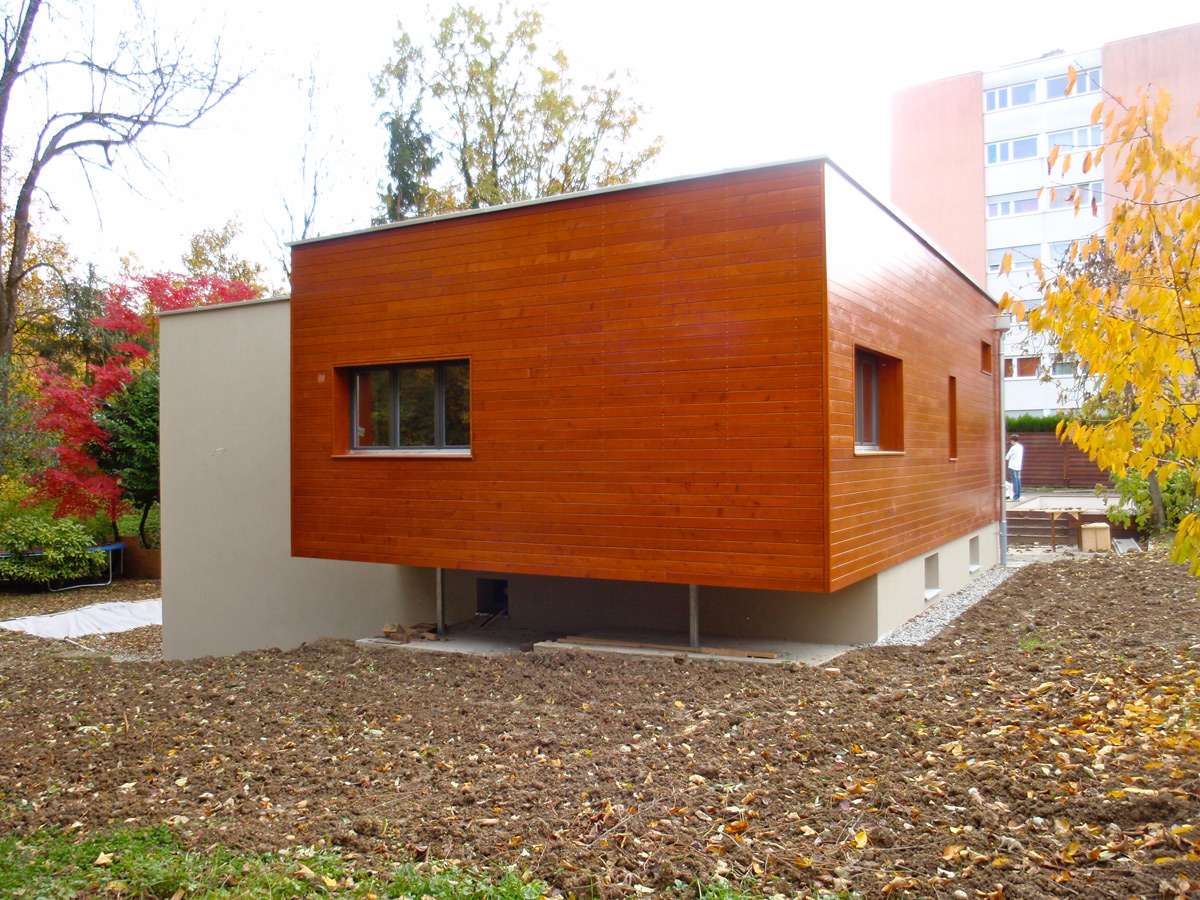 La partie bois a été totalement remplacée pour laisser la place à une boîte en ossature bois posée en porte-à-faux sur l’arrière.