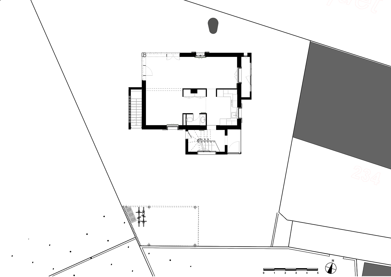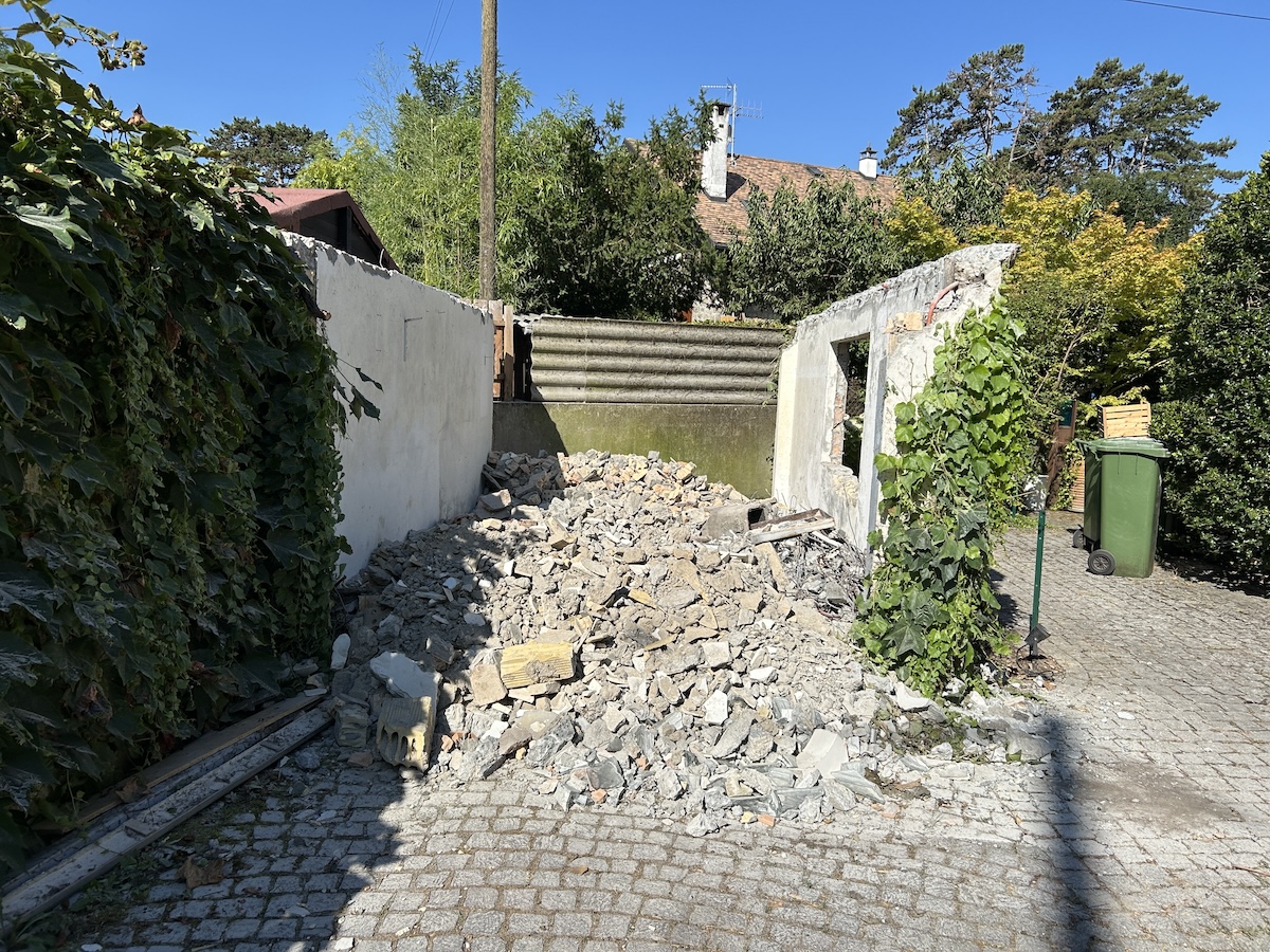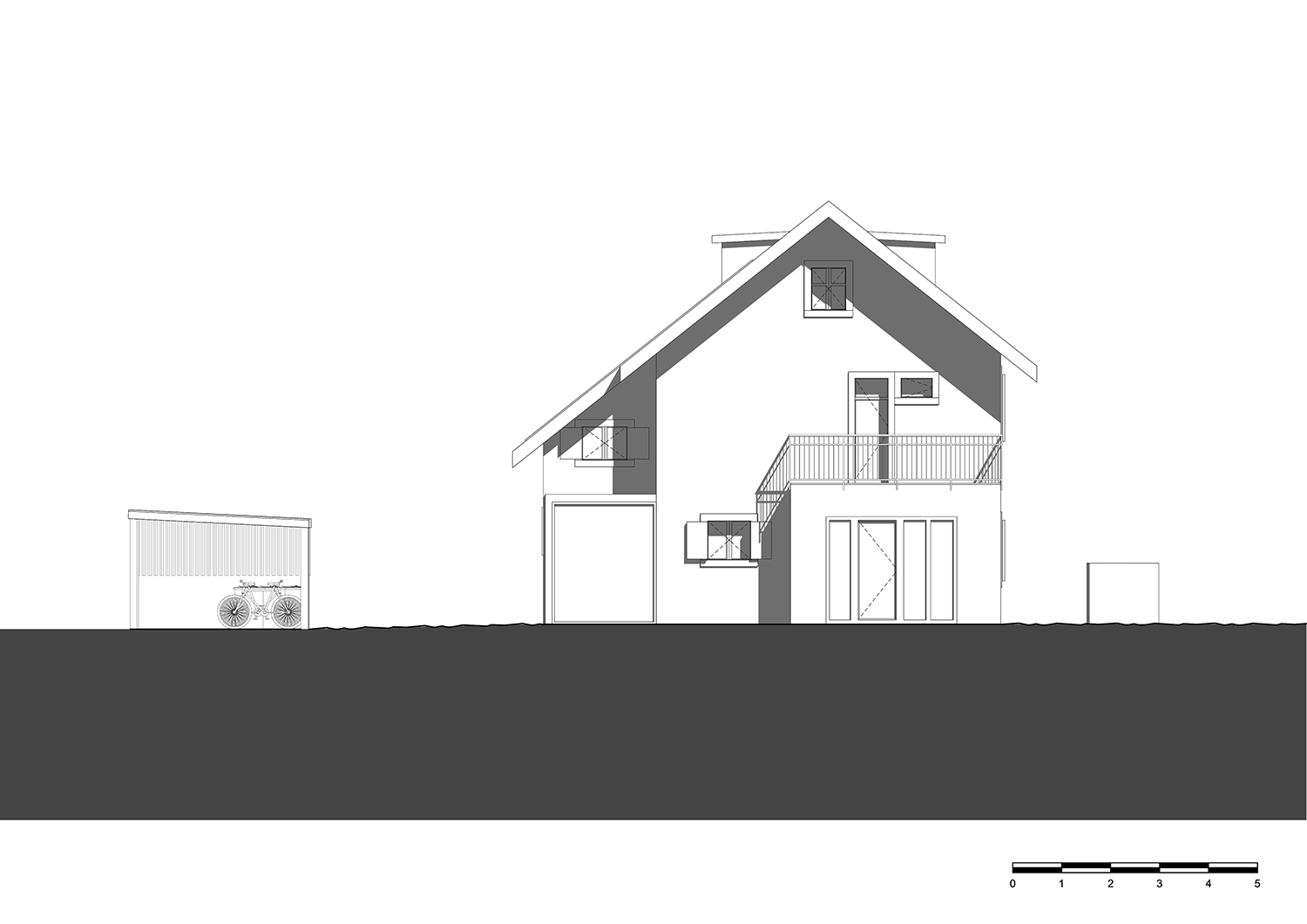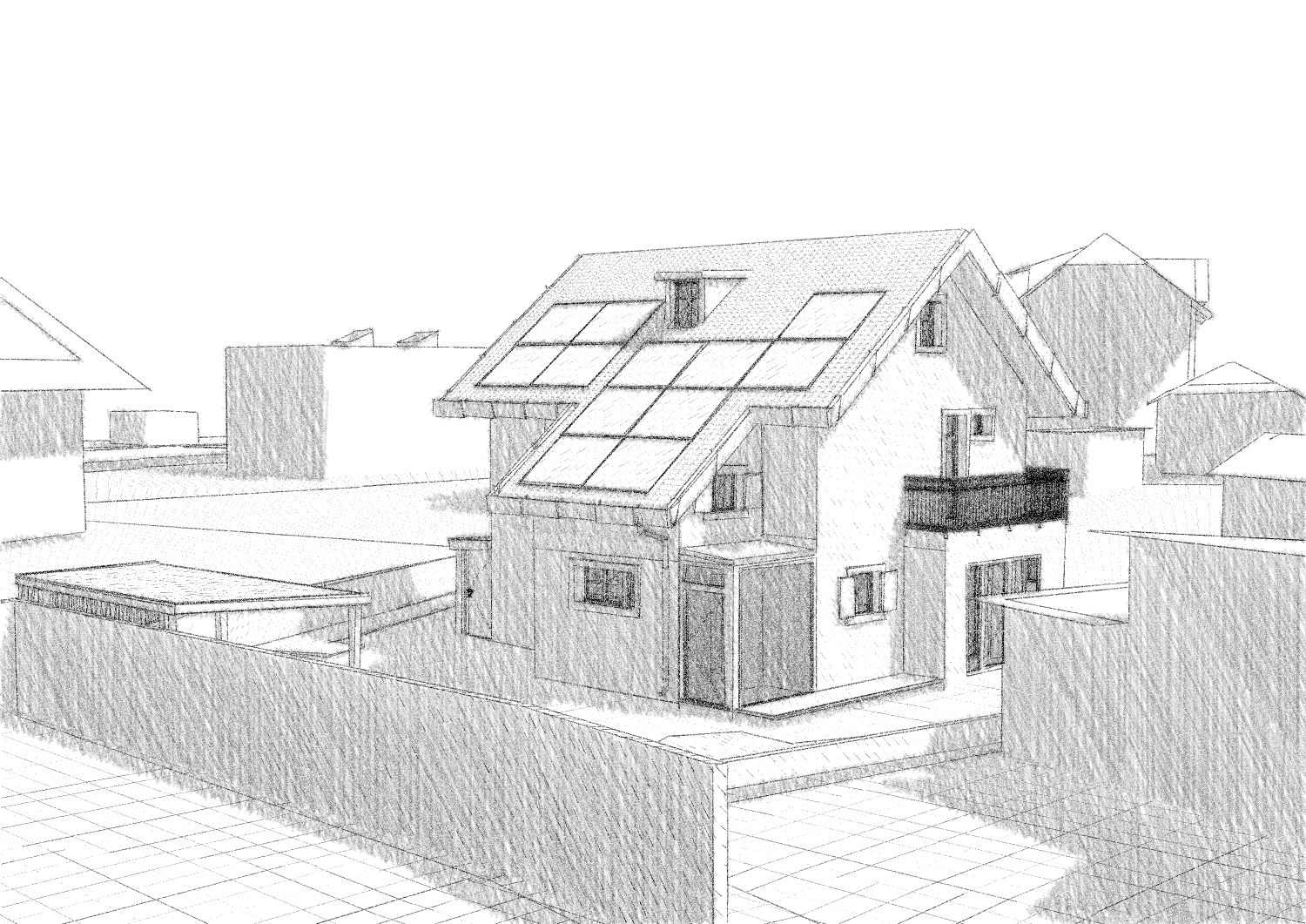 • Le remplacement du garage par un couvert à voitures équipé d’une toiture végétalisée, favorisant la gestion durable des eaux de pluie et la biodiversité locale.