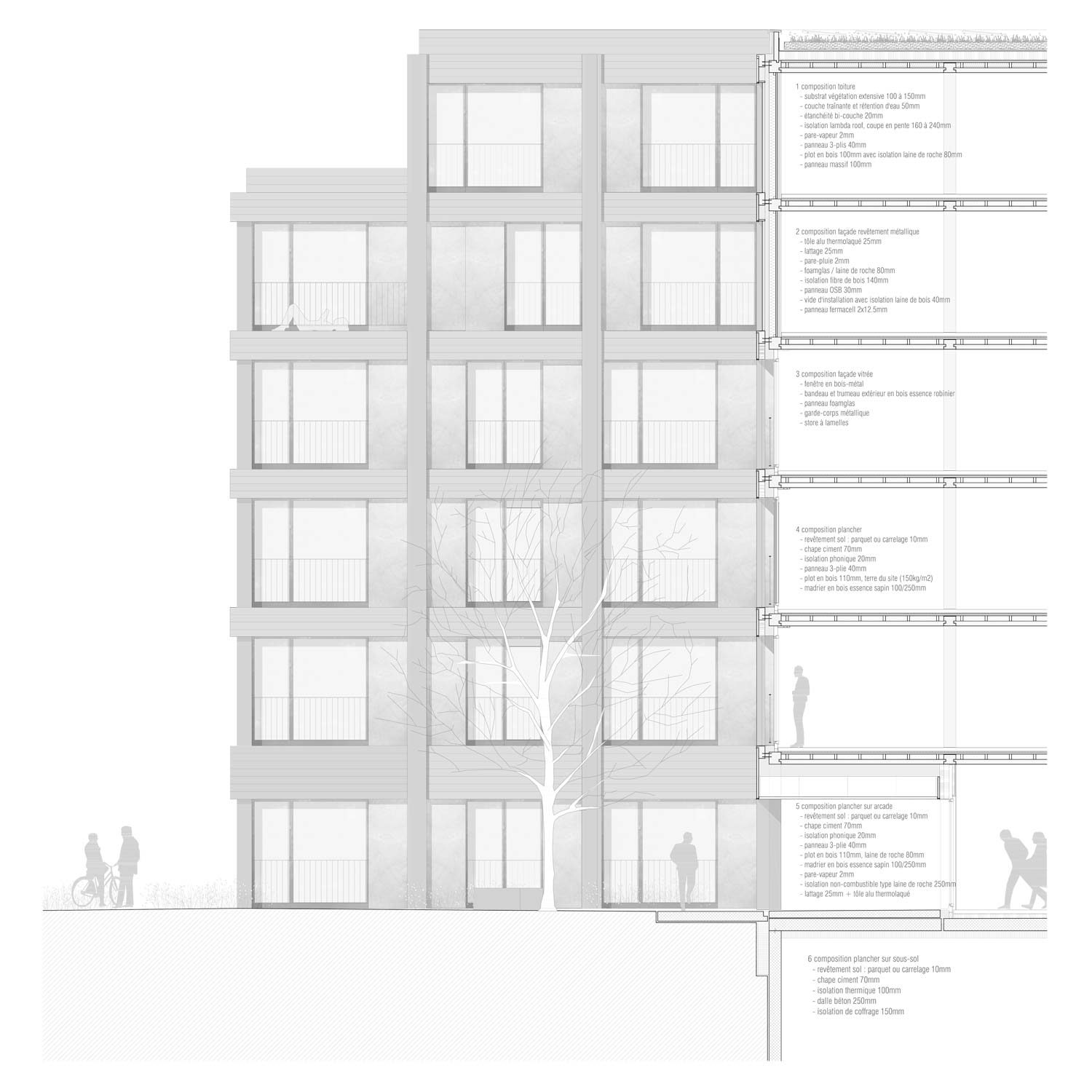 En ce qui concerne le concept énergétique, celui-ci se veut simple et efficient avec l’énergie primaire par CAD et panneaux photovoltaïques en toiture. Une ventilation simple flux est prévue et le découpage des façades protège les appartements du rayonnement solaire en été, les atriums, quant à eux, favorisant la ventilation et l’éclairage naturels des cages d’escalier.