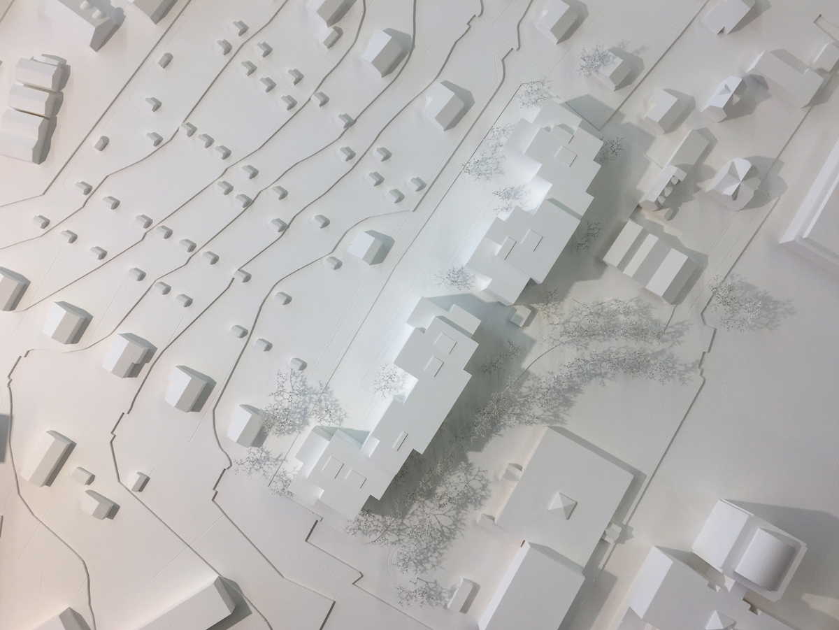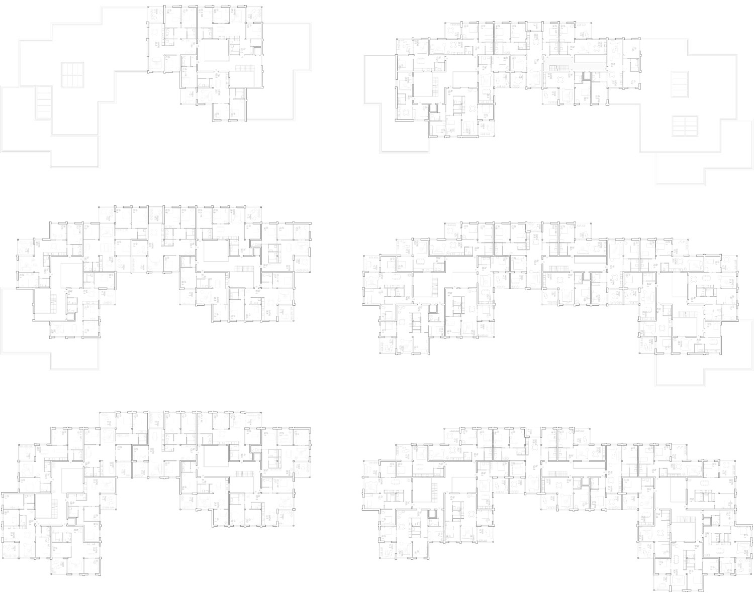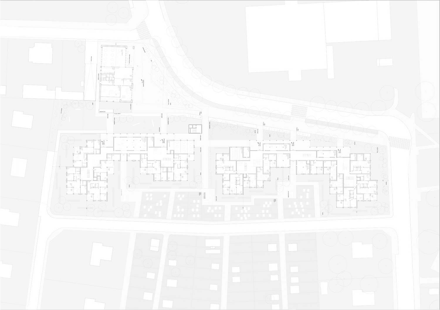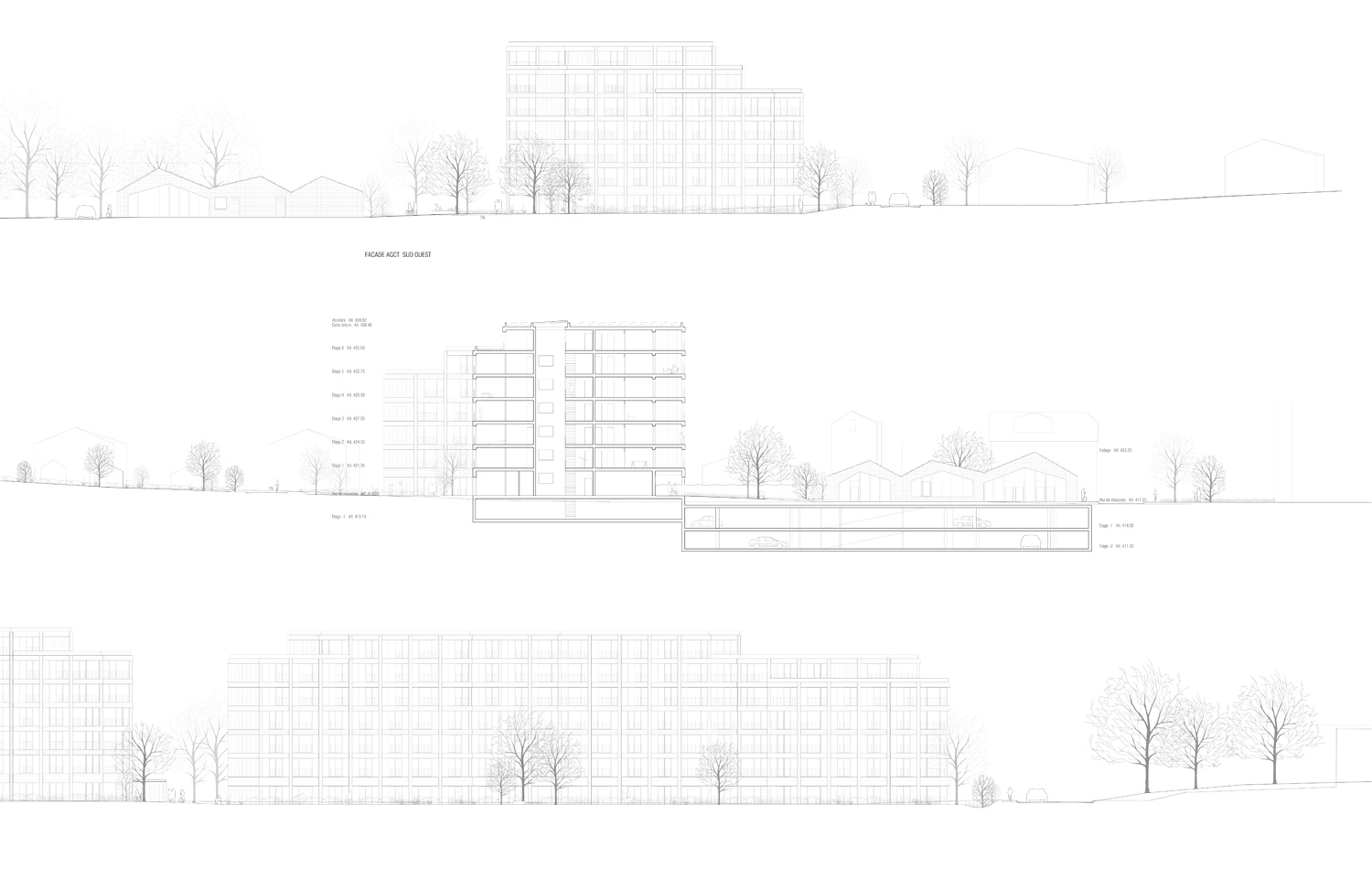 Les deux volumes se lisent dans une continuité spatiale, permise par le lien fort qui les unit, au moyen de la trame de façade rigoureuse. Ceci vise à atténuer l’effet de masse et est aussi un facteur d’organisation des typologies d’appartements.
