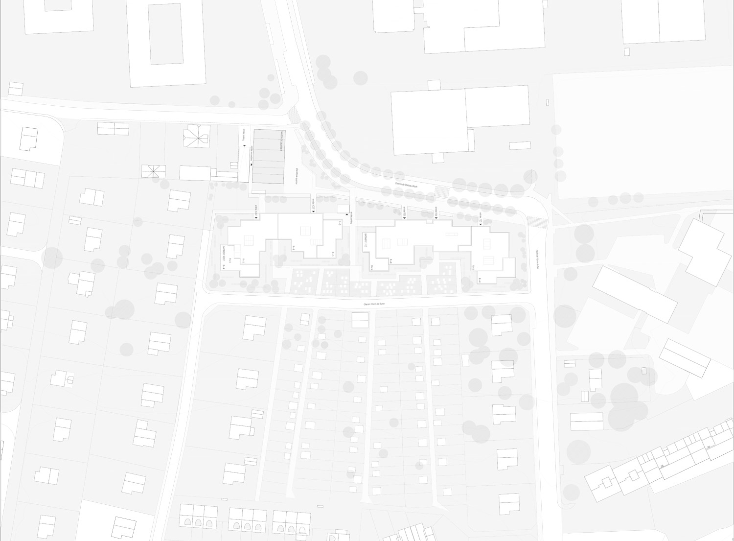 La construction des parcelles du périmètre présente un enjeu de taille en termes d’aménagements extérieurs et d’espace public. De plus, la nouvelle pièce du quartier se situera à la rencontre entre des espaces où l’identité est bien marquée. C’est pourquoi notre approche de la composition urbaine a pour ligne directrice la création d’espaces de cultures comestibles urbaines, qui composera l’espace selon leurs organisations spatiales. Ainsi, les différents programmes, avec des degrés de privatisations différents nous permettent de composer des espaces extérieurs tenant les bâtiments en distance par rapport à la rue et à ses nuisances tout en générant des périmètres de culture adaptés aux programmes de chacun, mais en mutualisant certaines fonctions.