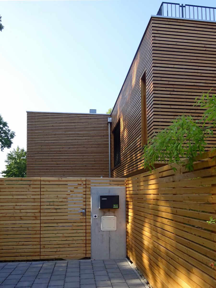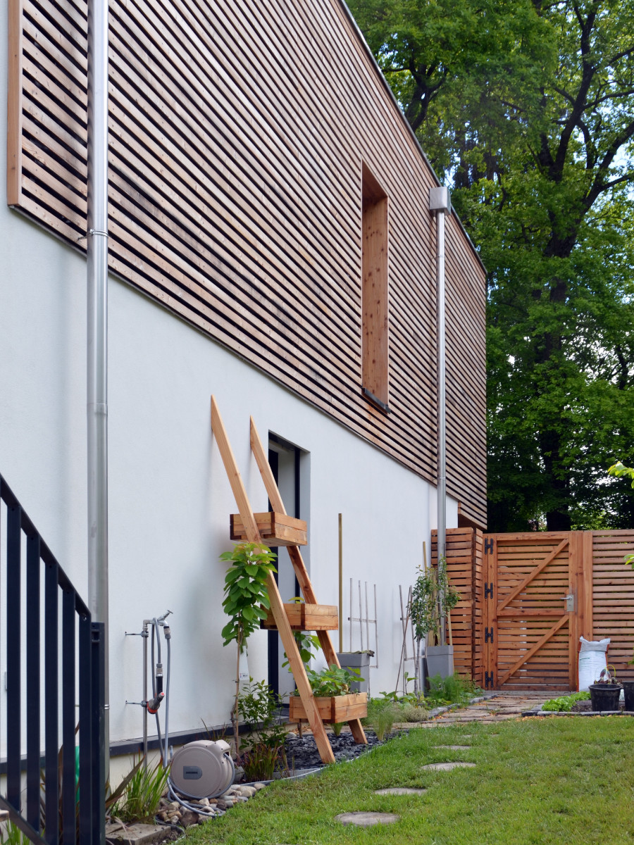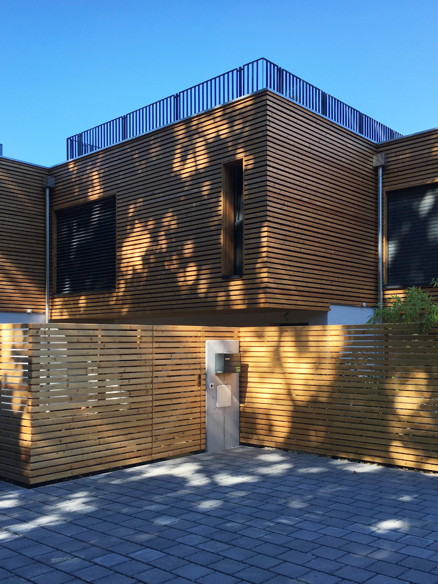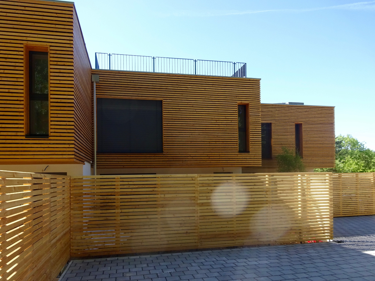 La structure des maisons est en ossature bois, revêtue de crépi au rez de chaussée et de lames mélèze ajourées à l’étage.