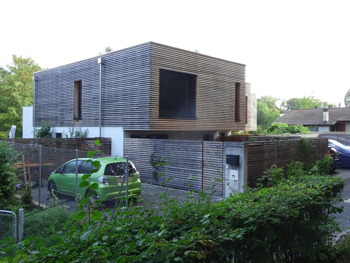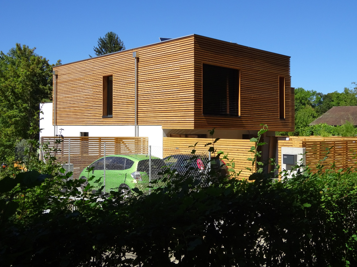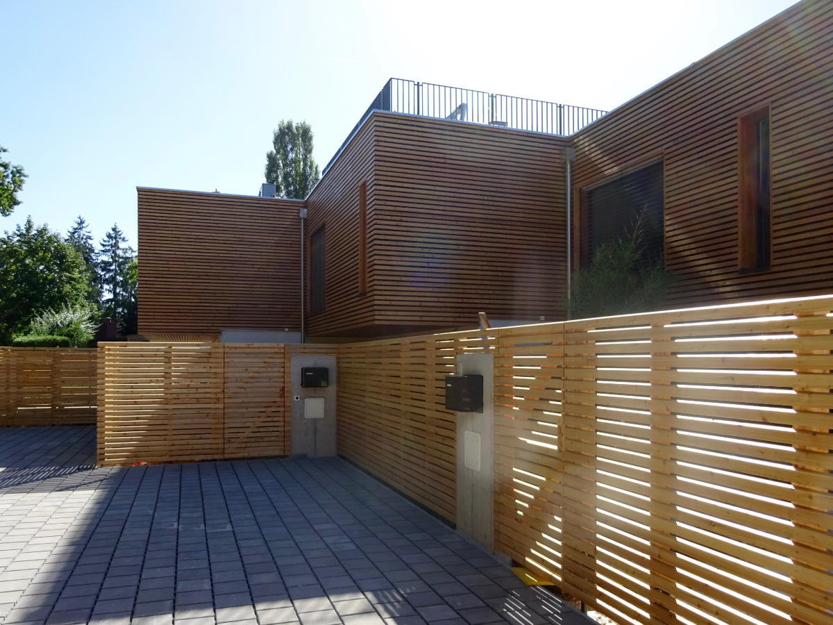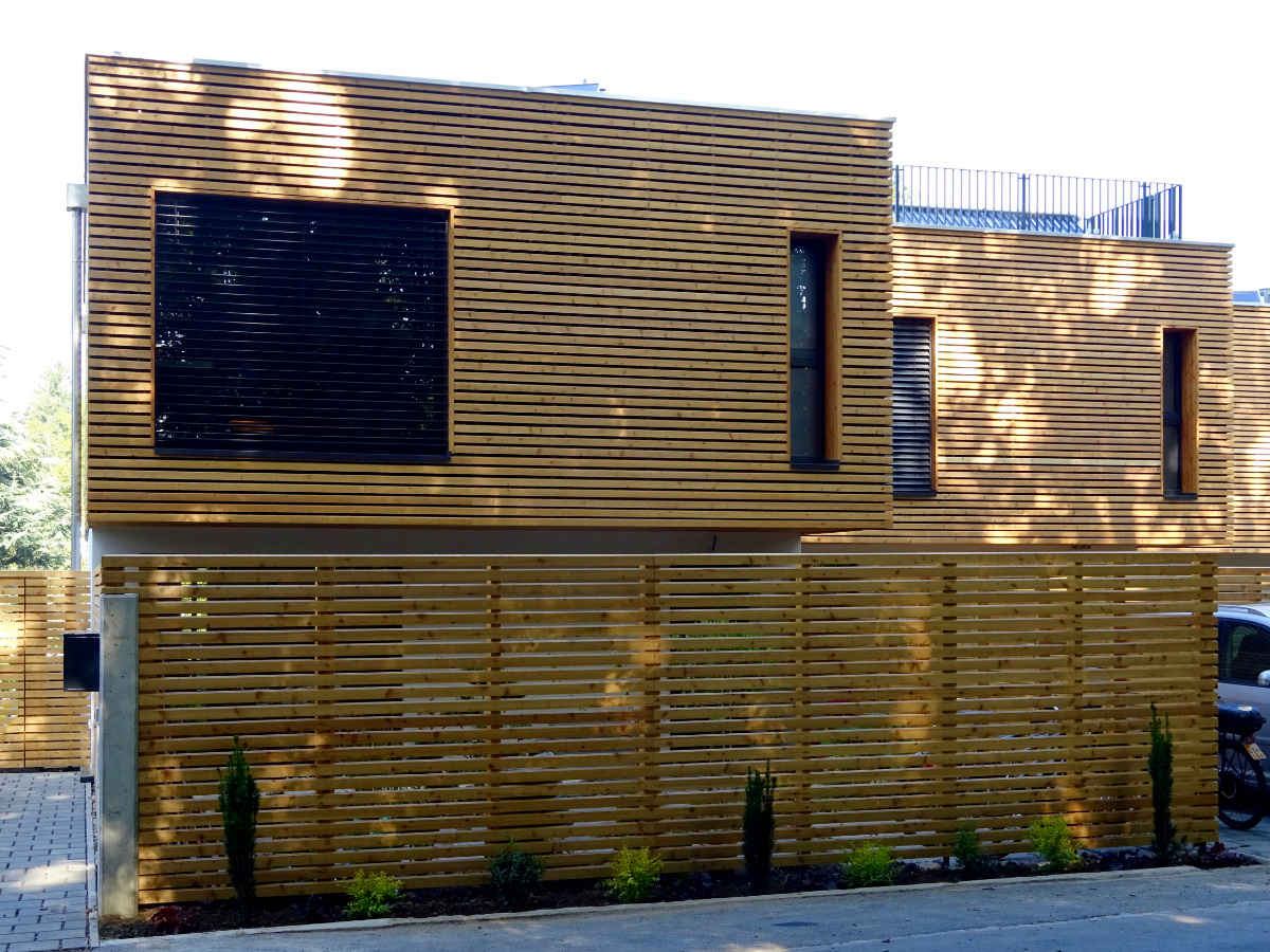 La structure des maisons est en ossature bois, revêtue de crépi au rez de chaussée et de lames mélèze ajourées à l’étage.