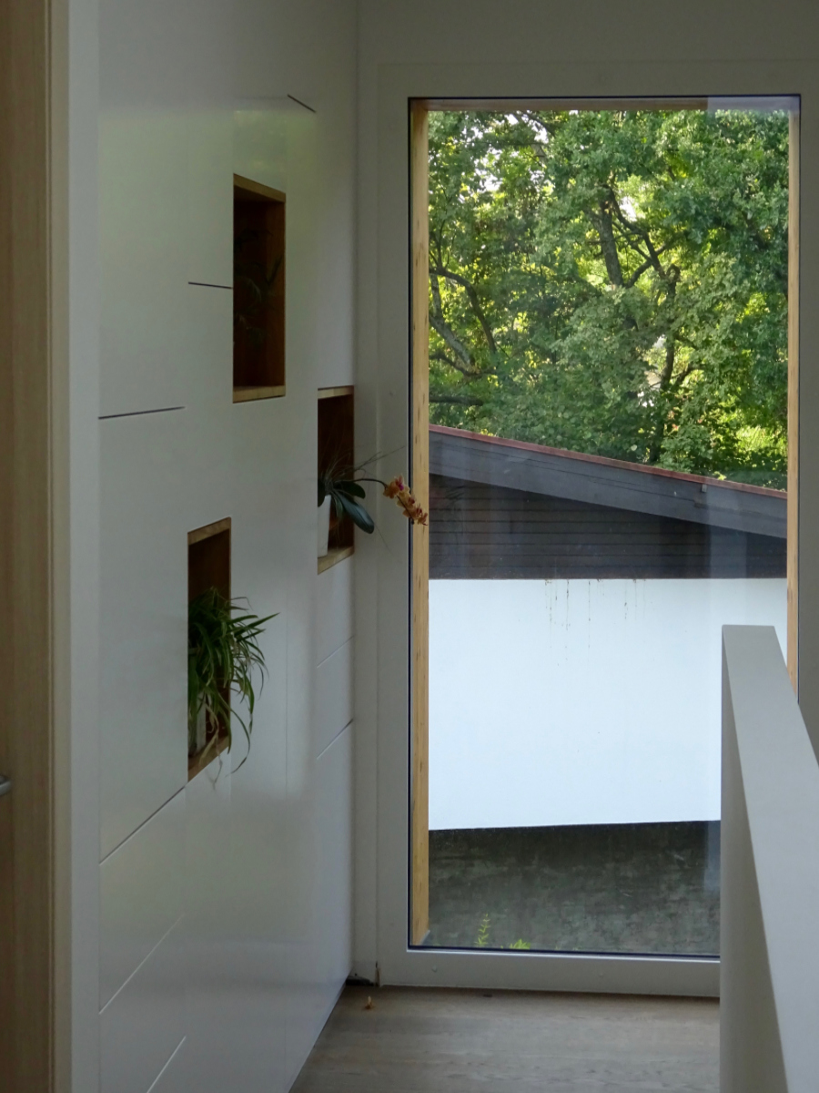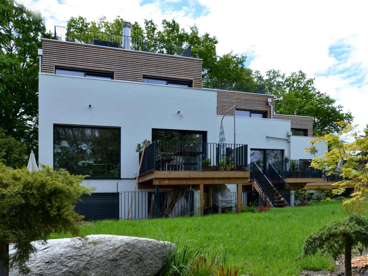 Leur intégration dans le site boisé est une des principales qualités qui ont attirés les futurs propriétaires au moment de la vente sur plans de ces maisons.