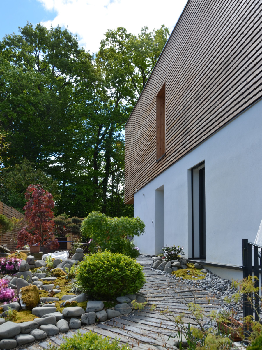 Côté rivière, les jardins descendent en pente jusque vers celle-ci, offrant une vue sur la forêt depuis les terrasses, sans division parcellaire, afin de conserver une vue sans clôture ni haie.