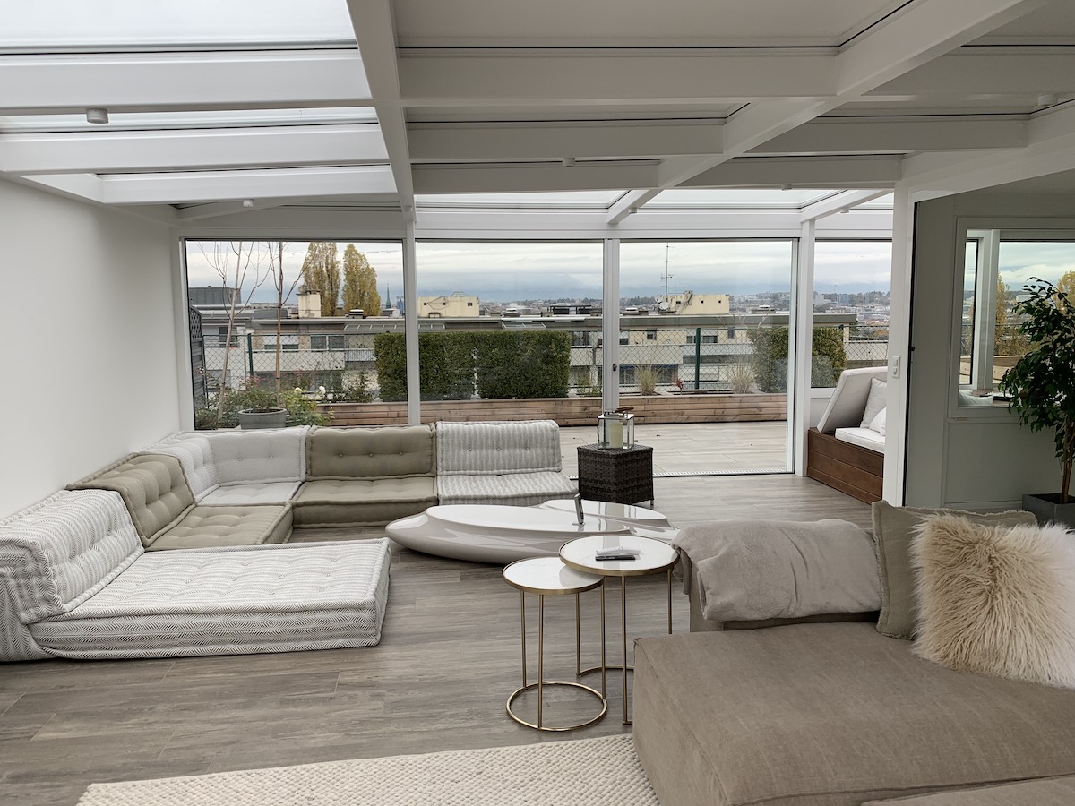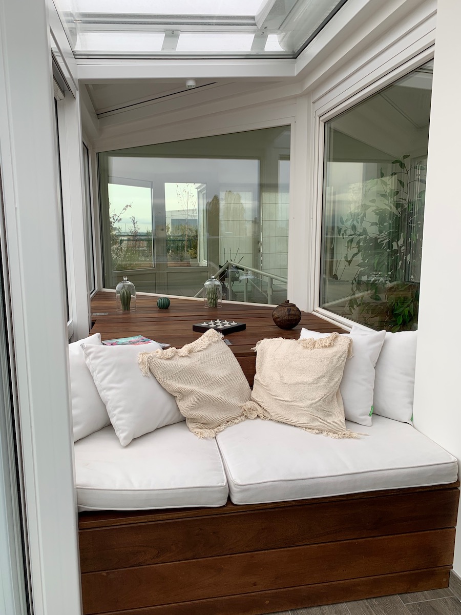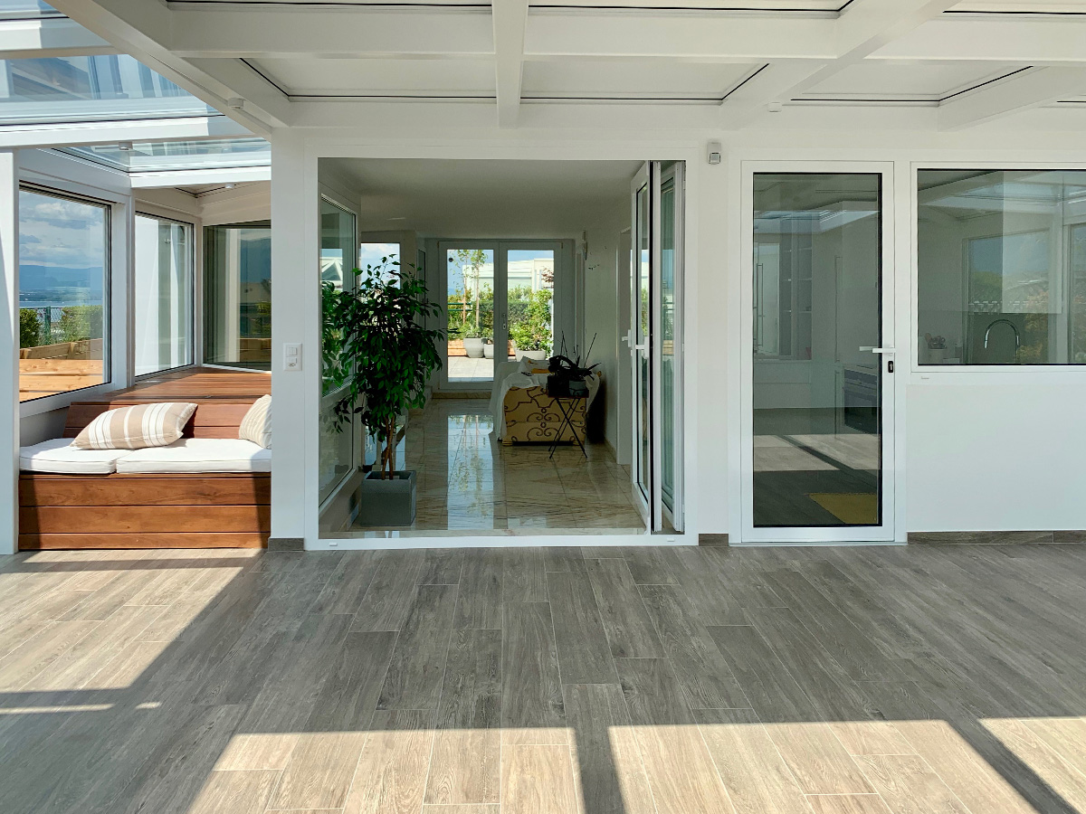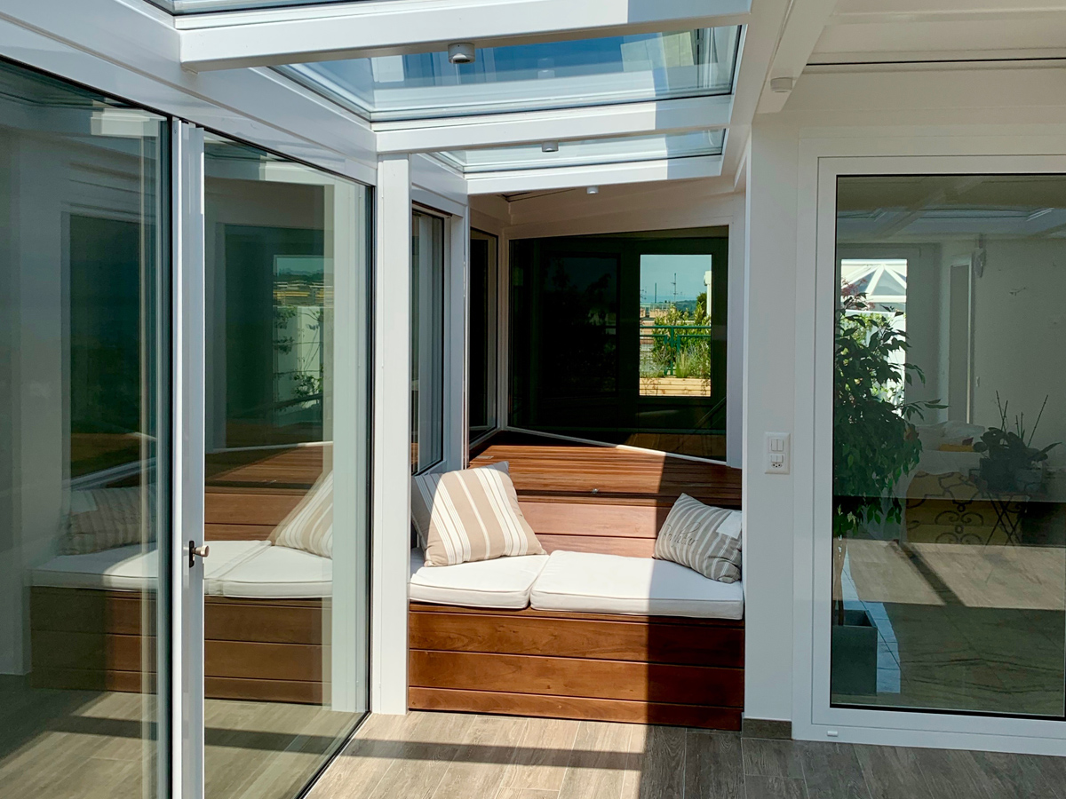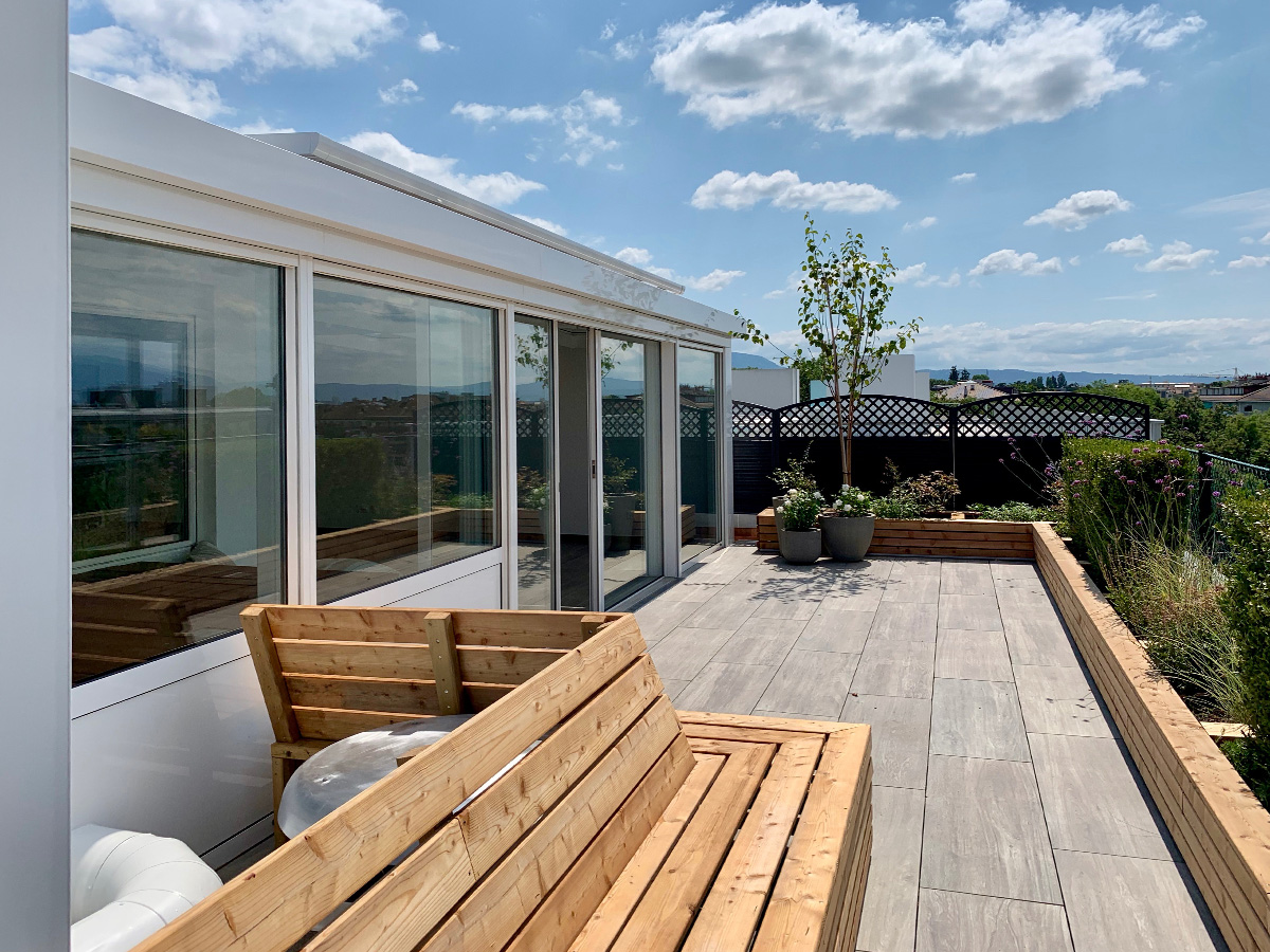 double vitrage, pose d’une nouvelle couche de carrelage dans la verrière et pose de dallettes en grès cérame sur plots réglables.