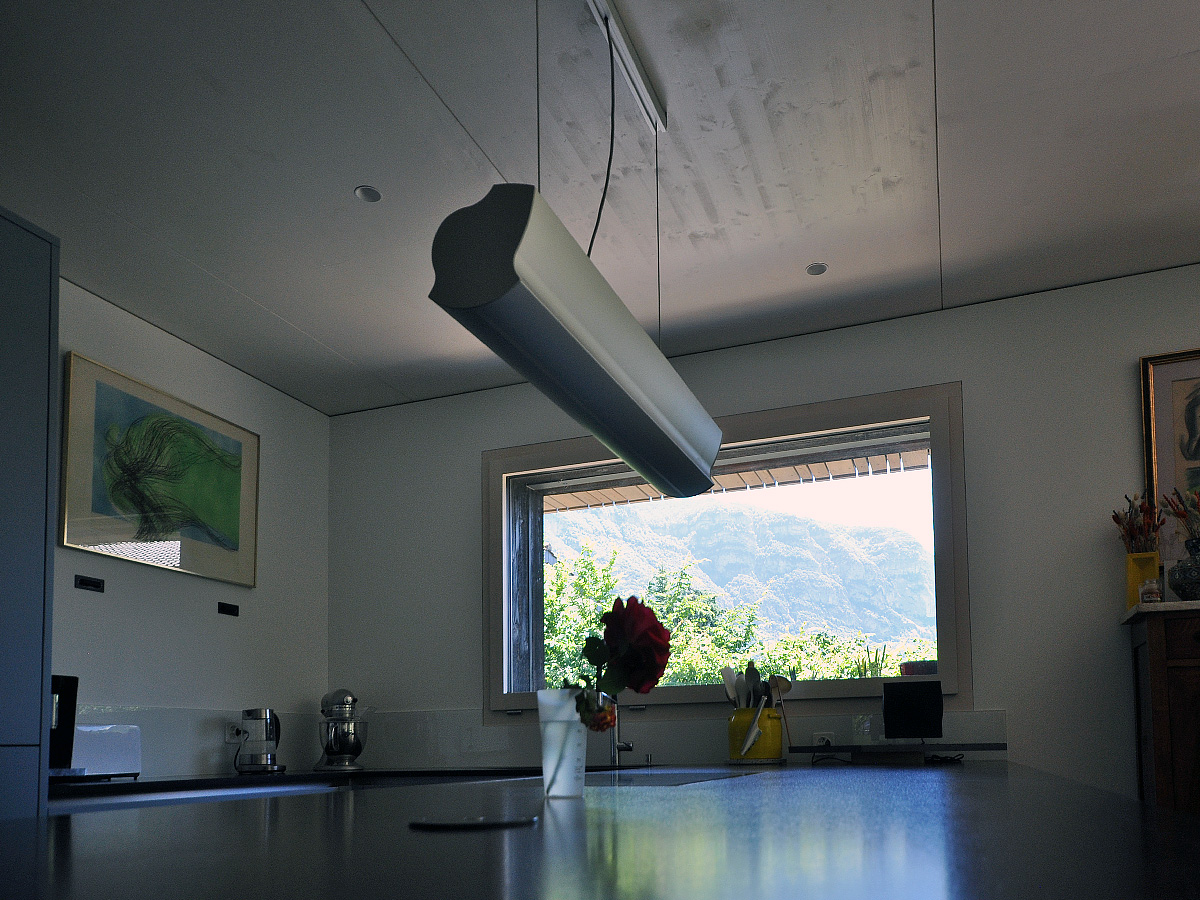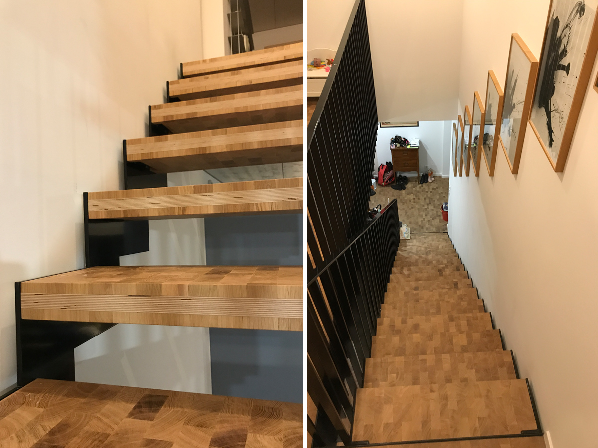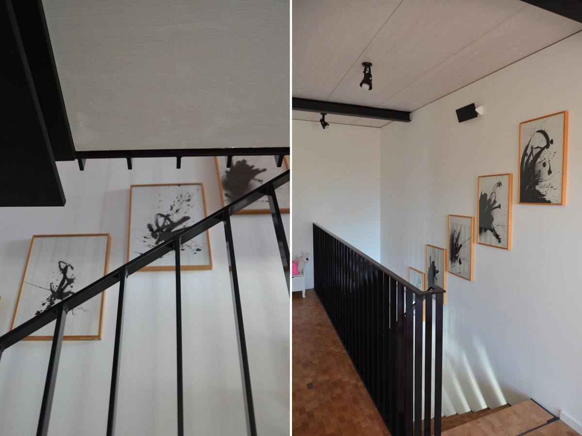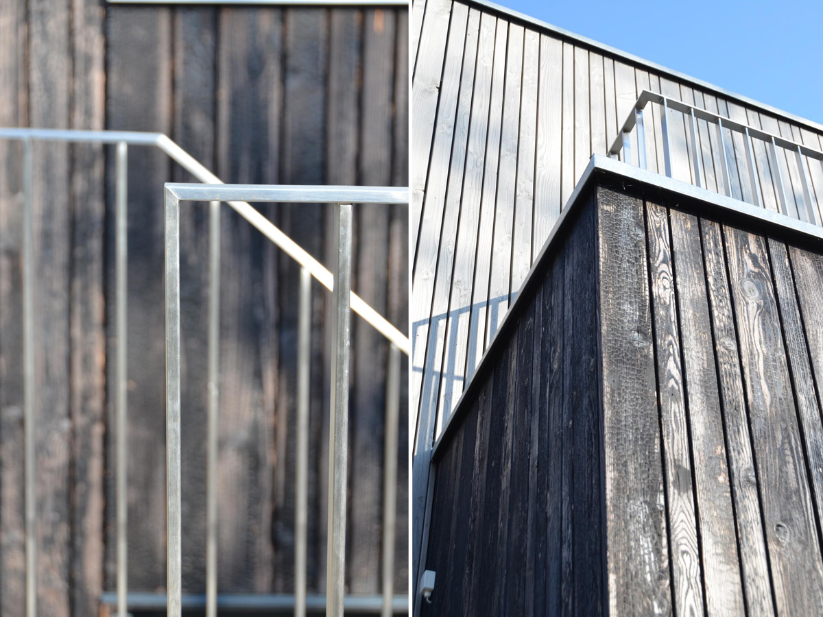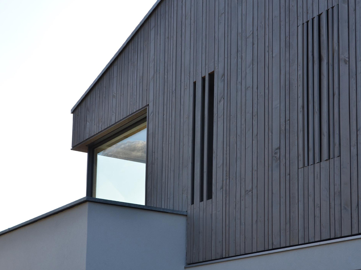 La toiture plate moderne et la toiture à deux pans, traditionnelle dans le quartier, contrastent et soulignent le caractère de chaque villa. L’utilisation du même type de bardage en bois permet de souligner la cohérence de l’ensemble. Composé de lames de douglas avec trois différentes largeurs et posé en claire-voie, le bardage entoure le premier étage des deux villas comme une ceinture. Au niveau de la rue, un bardage avec des lames brûlées, technique ancestrale japonaise de protection du bois appelée « Shou Sigu Ban », contraste avec le crépi gris clair.
