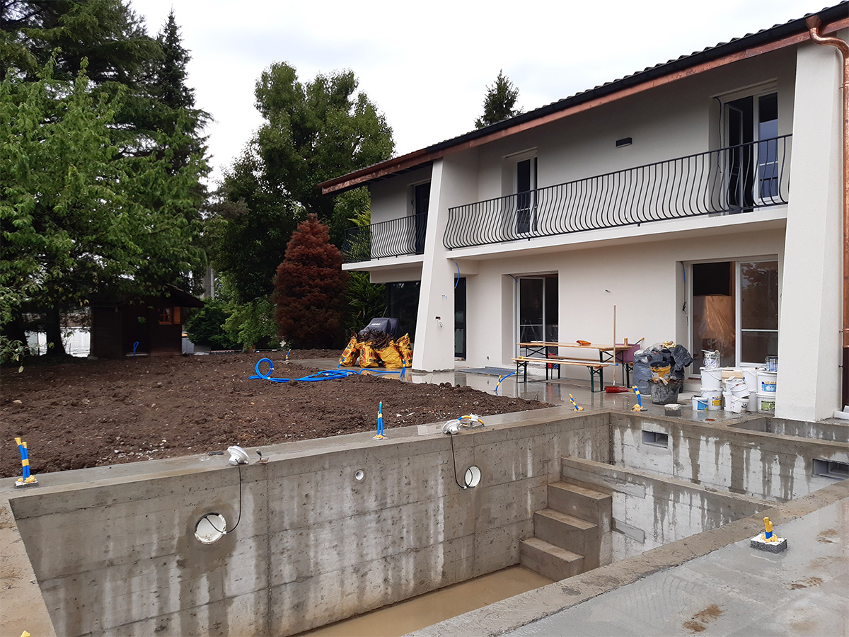 L’ancienne piscine a été remblayée, et une nouvelle piscine a été construite devant la terrasse principale de la villa.