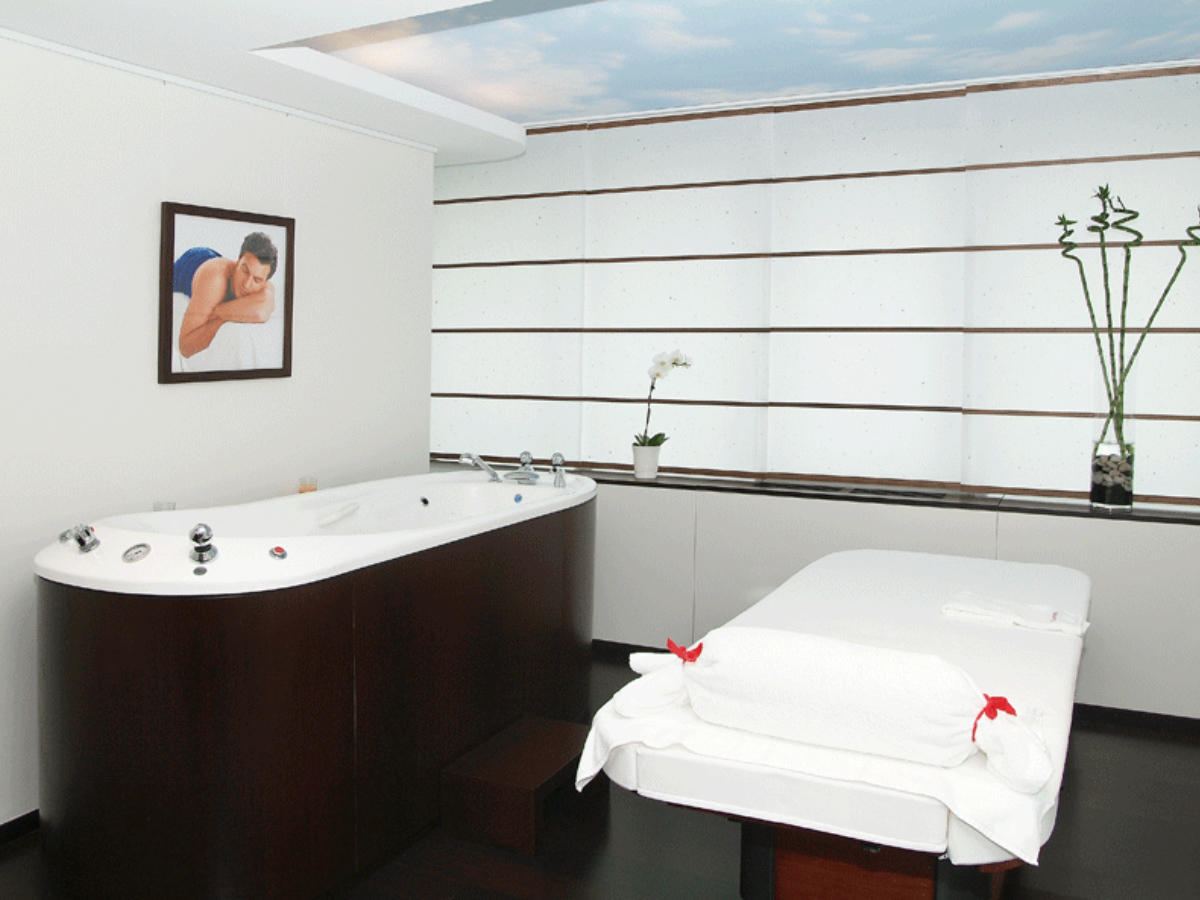 Il comporte, outre la réception, une tisannerie et un work-shop, 5 cabines de soins dont une double, une cabine balnéo, un sauna et un hammam, une salle de repos et un fitness. Il dispose également de vitrines maquillage et soins.