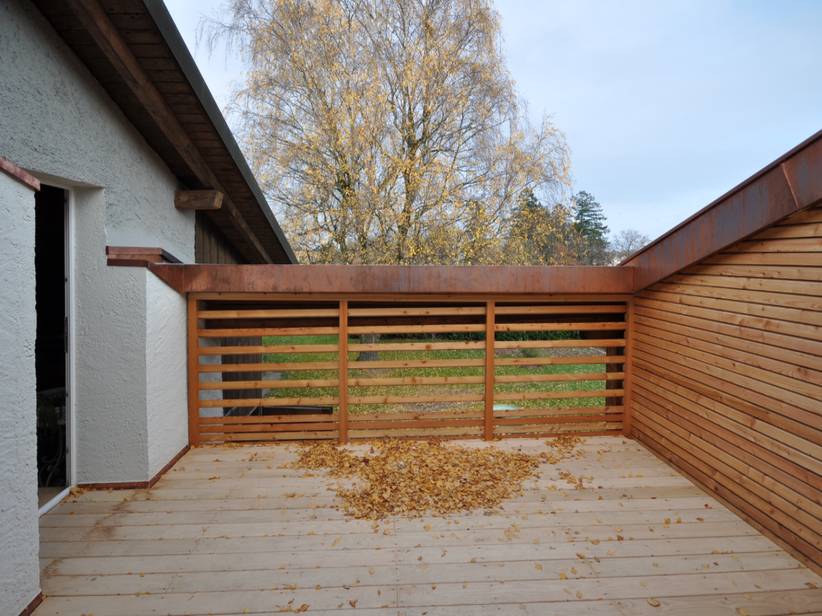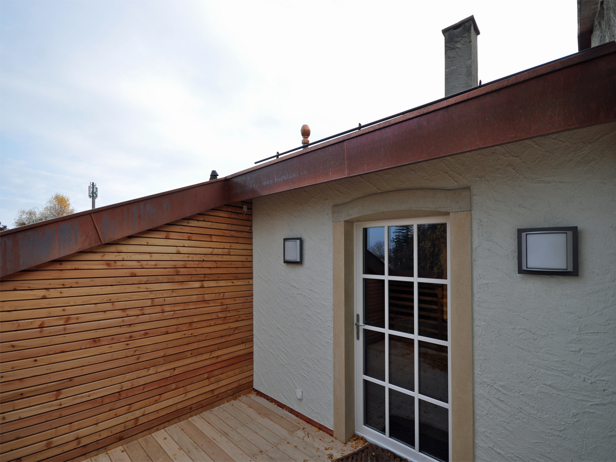 Afin de donner aux trois logements un accès au jardin, une terrasse a été créée dans le toit pour celui-ci, donnant à son tour sur une remise accédant au jardin.