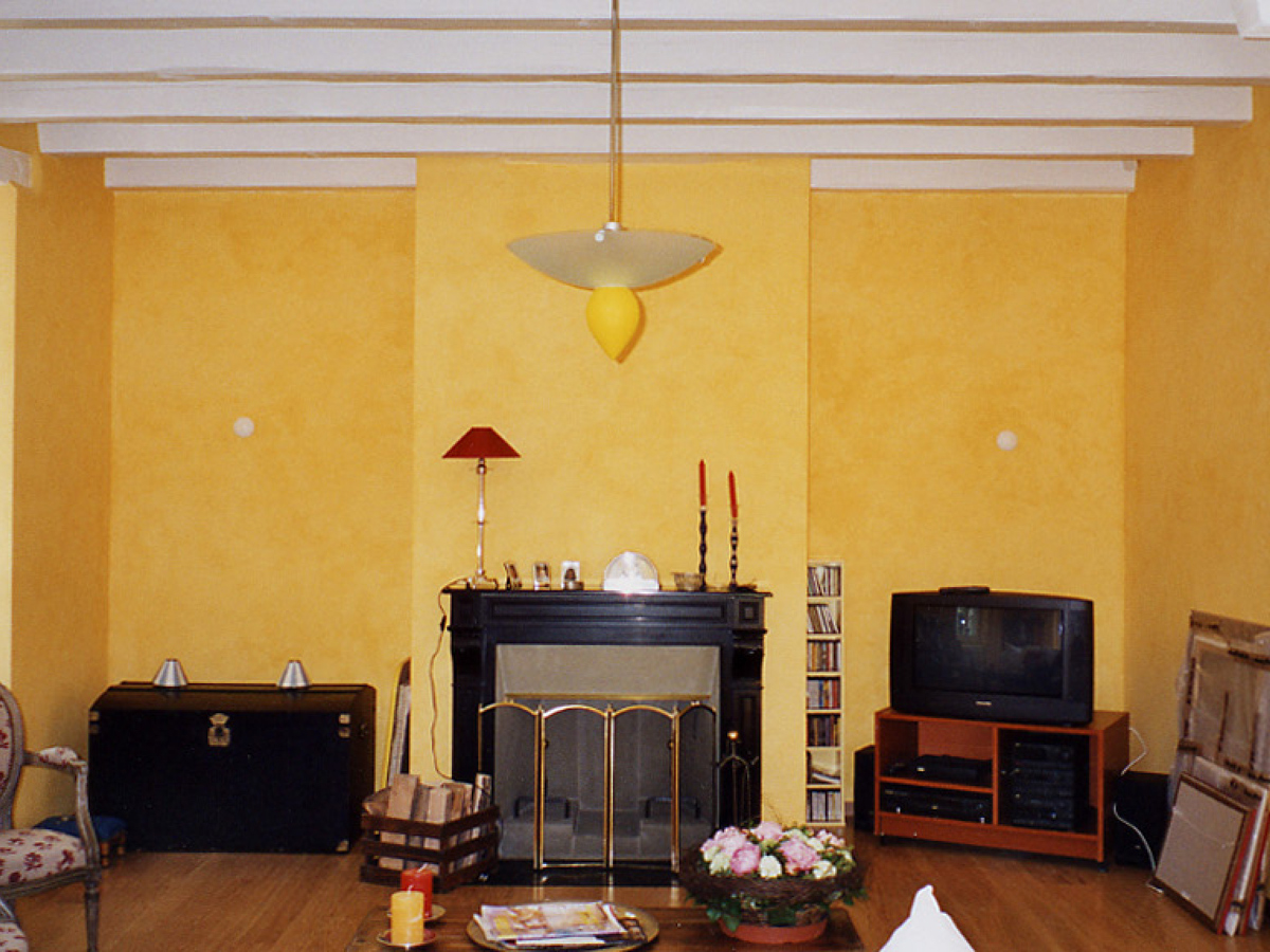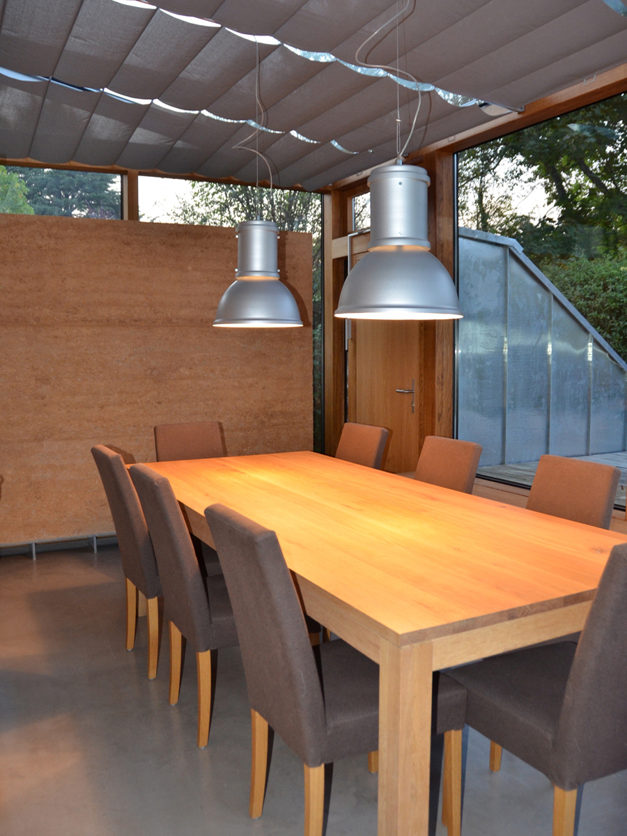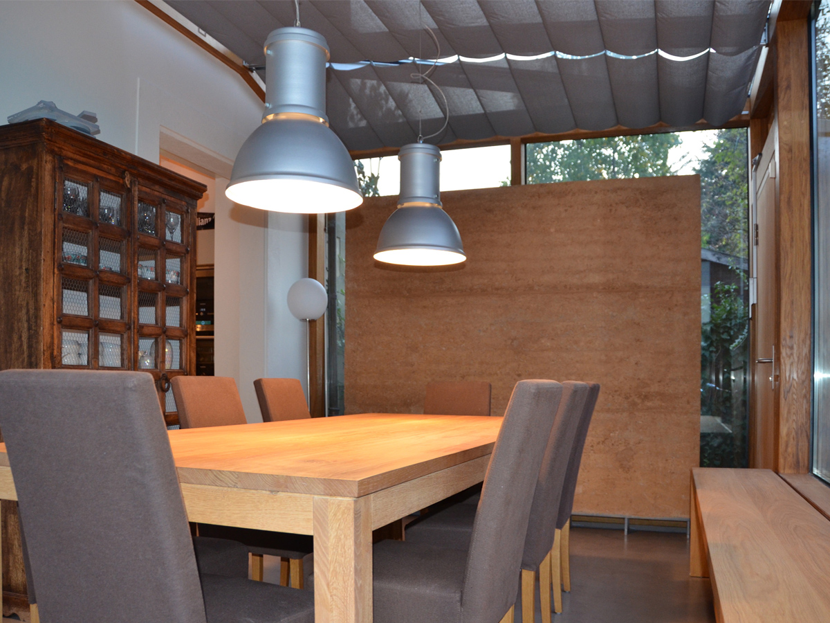 Un mur en pisé (terre crue) a été bâti sur le côté mitoyen afin de masquer la vue directe du voisinage et de récupérer la chaleur emmagasinée la journée pour la restituer le soir. Ce mur renforce encore le côté chaleureux du jardin d’hiver et permet de tempérer cette pièce de façon naturelle.