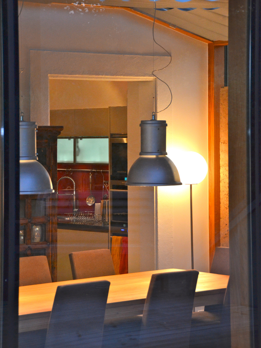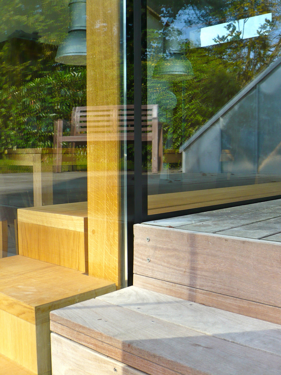 Nous avons proposé que la nouvelle verrière soit construite avec une ossature en chêne, procurant ainsi une ambiance intérieure chaleureuse s’accordant au meuble central de la cuisine dessiné également sur mesure. Les vitrages ont été installés avec système permettant de ne voir que le verre de l’extérieur (verre collé), protégeant ainsi la structure et apportant un aspect très contemporain à la verrière tout en garantissant un excellent confort thermique.