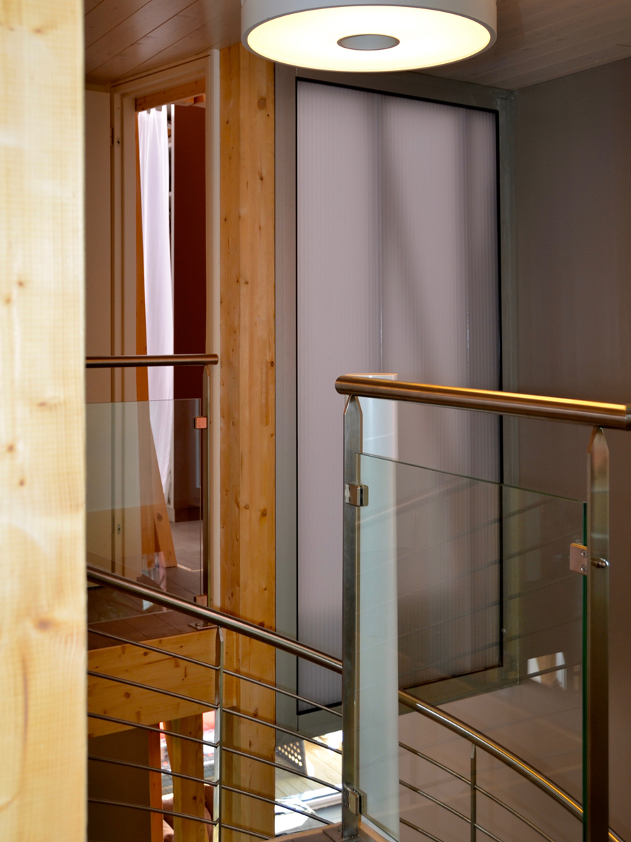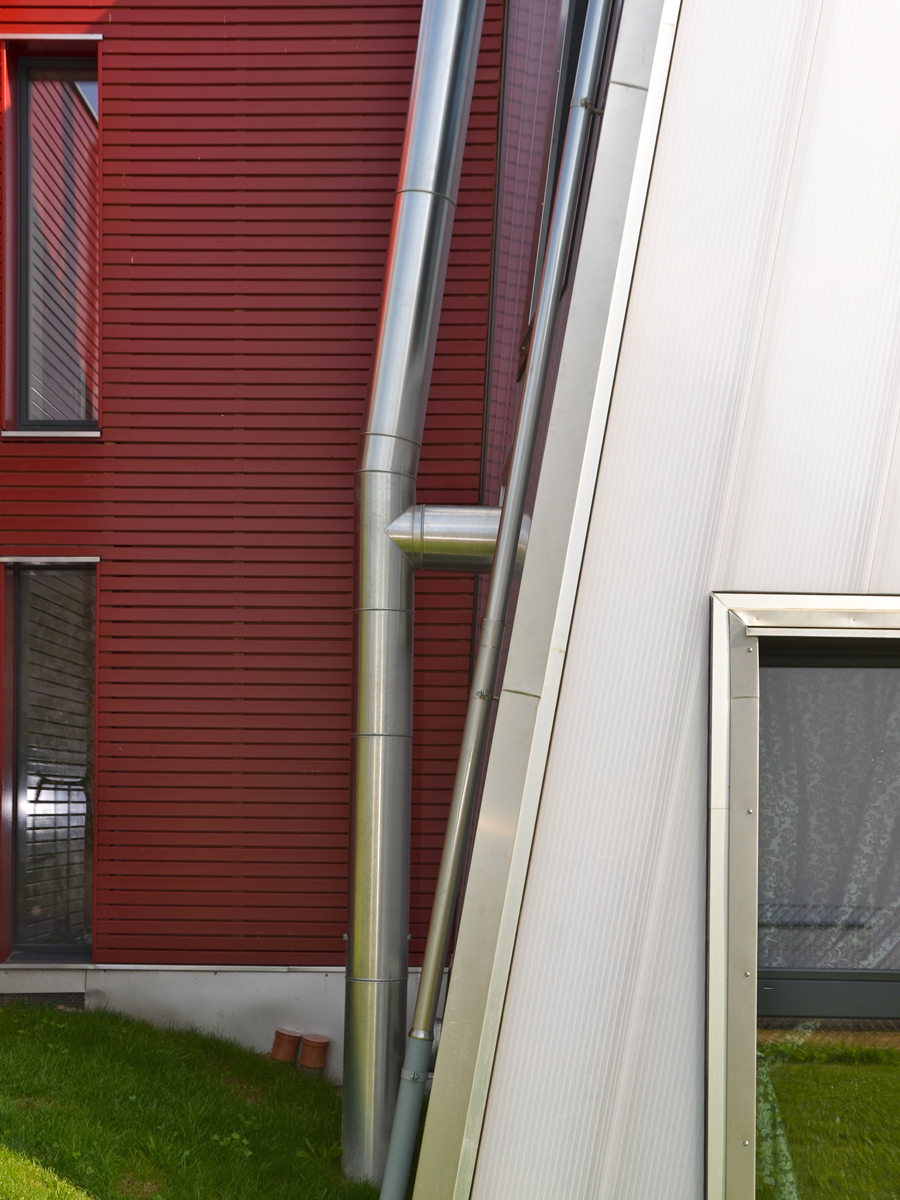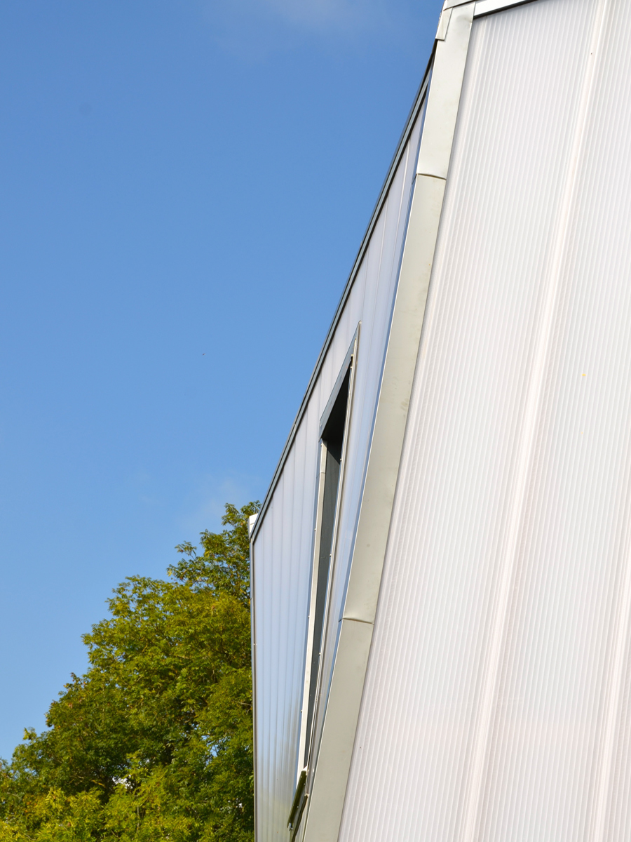 Le choix du polycarbonate comme enveloppe pour le «silo» découle d’un choix architectural et technique. Ce matériau permet d’avoir un volume très lumineux tout en gardant une intimité et supportant les torsions voulues pour la façade.