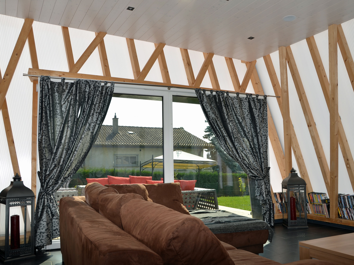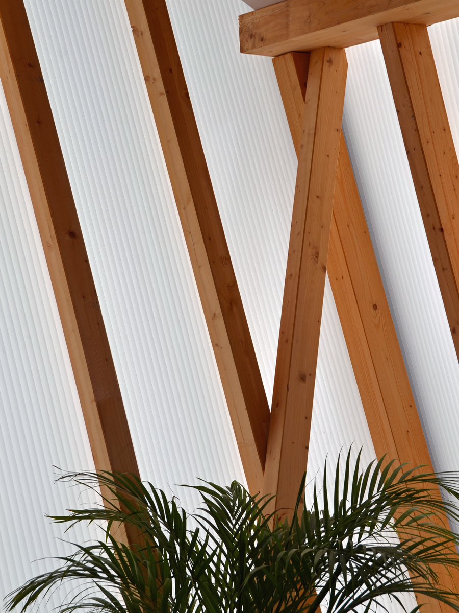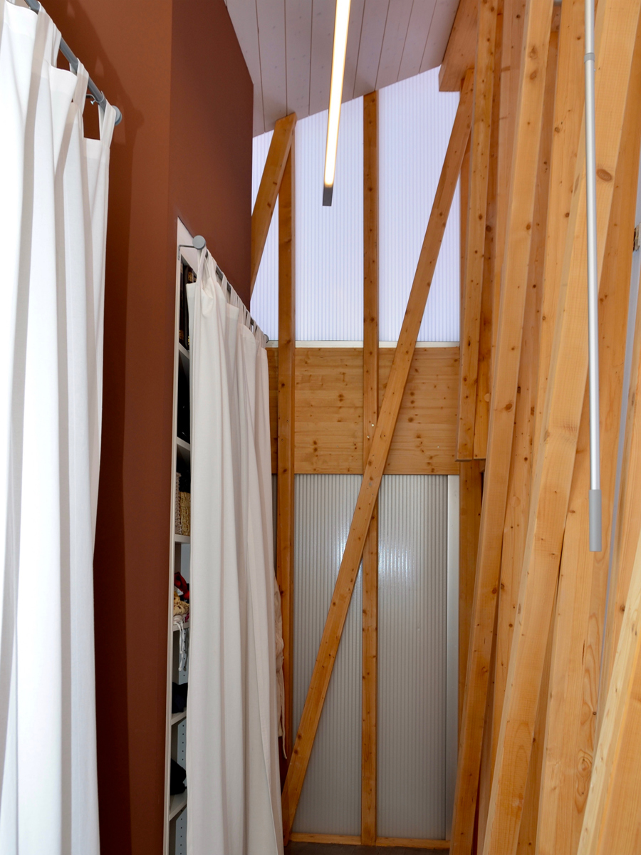 Le choix du polycarbonate comme enveloppe pour le «silo» découle d’un choix architectural et technique. Ce matériau permet d’avoir un volume très lumineux tout en gardant une intimité et supportant les torsions voulues pour la façade.