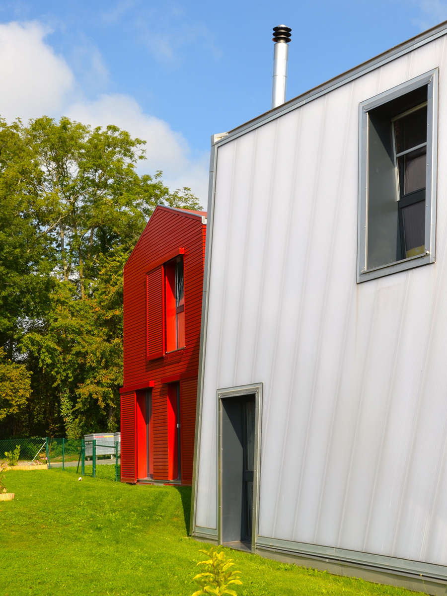 On retrouve l’image du «silo à grain » à travers le volume translucide en polycarbonate dans lequel sont logés le salon au rez-de-chaussée, la chambre des propriétaires ainsi qu’un dressing et une salle de douche à l’étage, et le « corps de ferme » avec ses façades en bardage rouge, contenant lui l’entrée, la cuisine et la salle à manger au rez, les quatre chambres d’enfants et une salle de bain à l’étage.