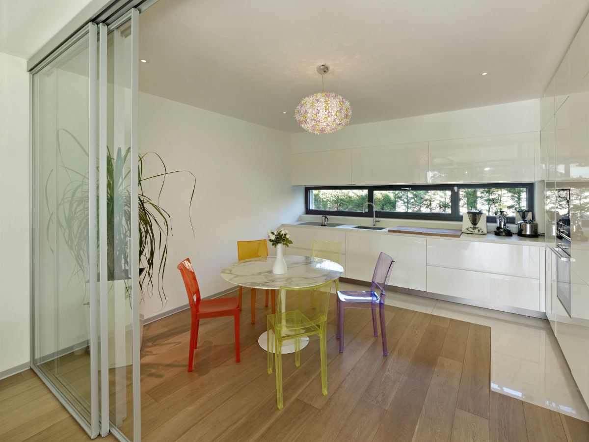 Le chauffage est assuré par des pompes à chaleur sol/eau, l’eau chaude sanitaire étant fournie par les panneaux solaires thermiques. Une ventilation double-flux complète l’installation technique.