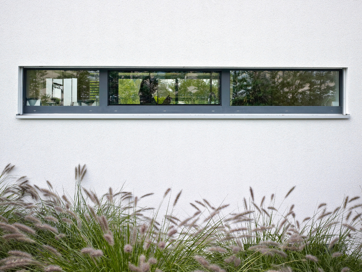 Au sud-ouest, côté jardin, de grandes baies vitrées éclairent par contre l’intérieur sur toutes la profondeur des villas. Elles connectent les salons aux jardins et les grandes fenêtres en bandeaux de l’étage laissent également généreusement la lumière envahir l’espace.