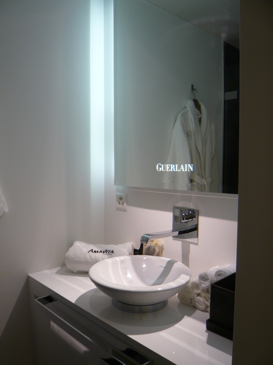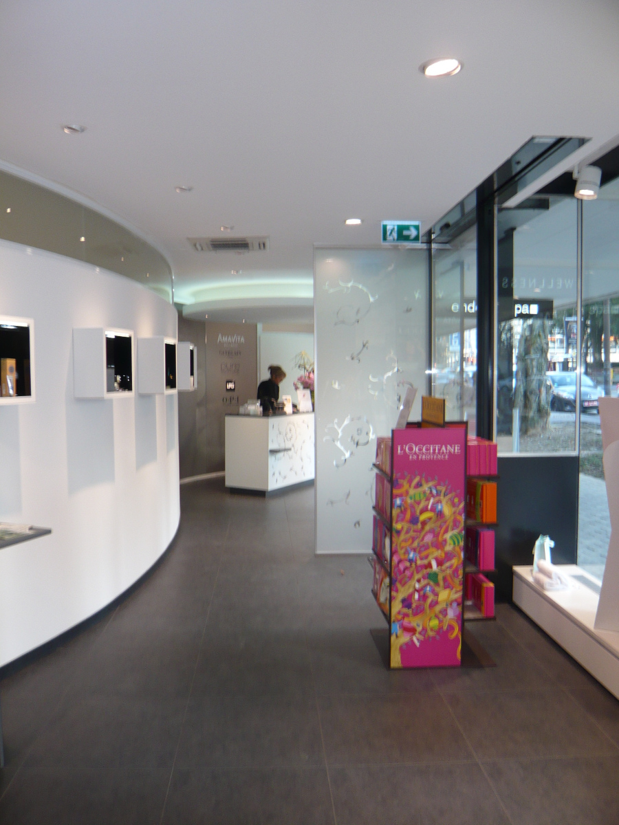 L’originalité du projet réside dans la création de parois courbes et de faux plafonds avec corniches lumineuses qui ondulent dans l’espace et invitent à venir se détendre. Des éléments de faux plafonds bas viennent mettre en valeurs plots de présentation de vente et desk de réception en Corian ornés de motifs découpés, en les soulignant de leur lumière.